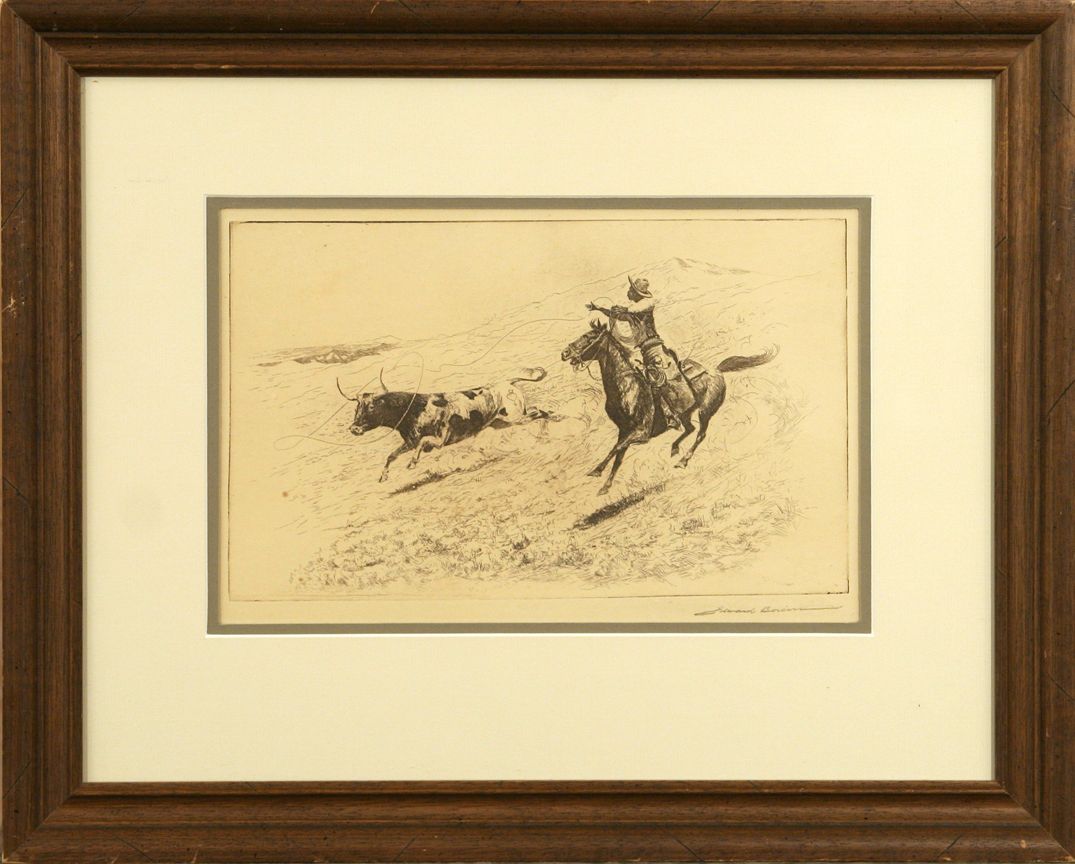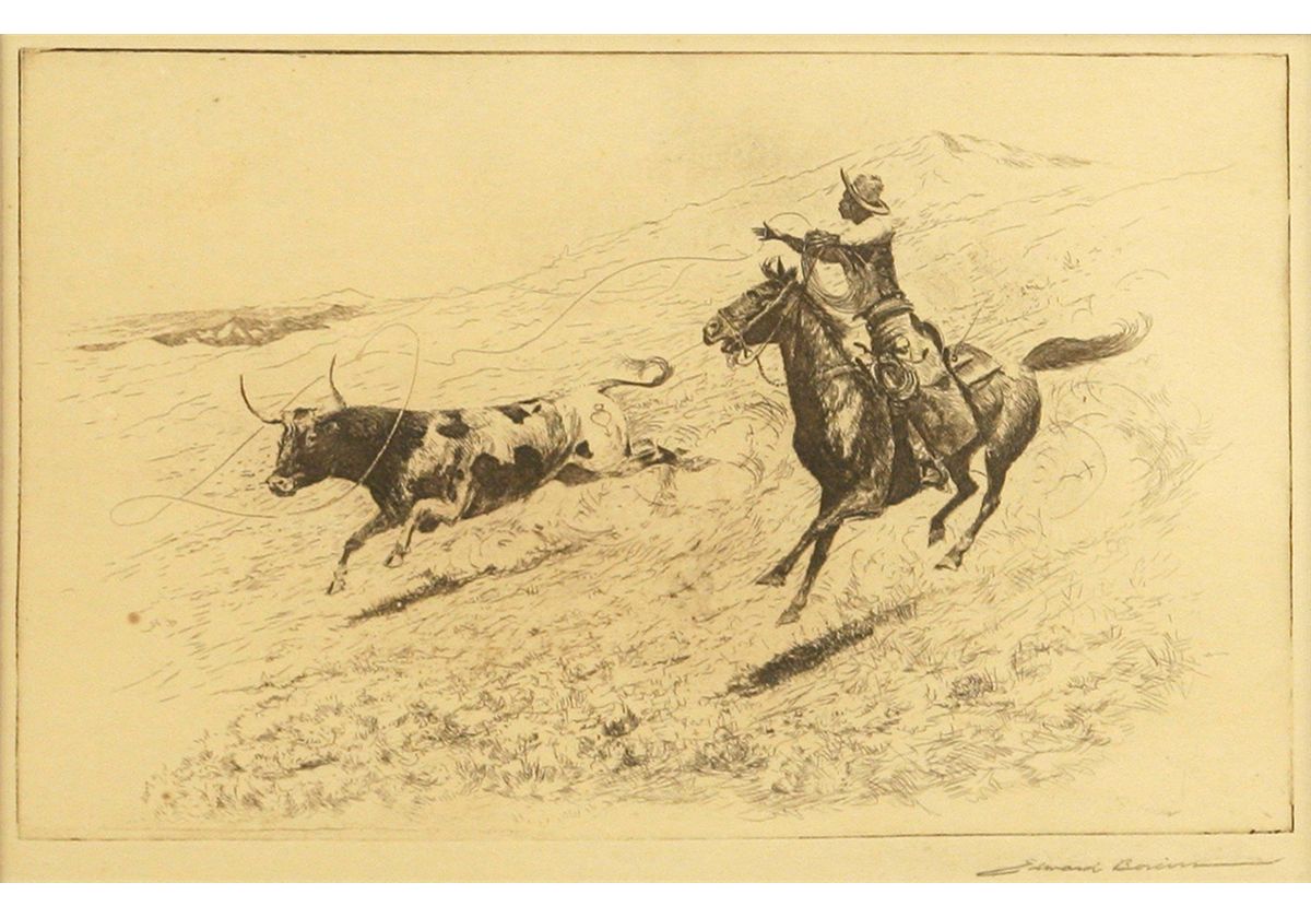 Edward Borein (1872 - 1945). End Of The Race. 7 ¼" x 11 ¾" etching, second state. Pencil signed lower right: Edward Borein. #131 The Etchings of Edward Borein by John Galvin. Condition reports can be viewed at www.marchinmontana.com/docs/2013CR.pdf