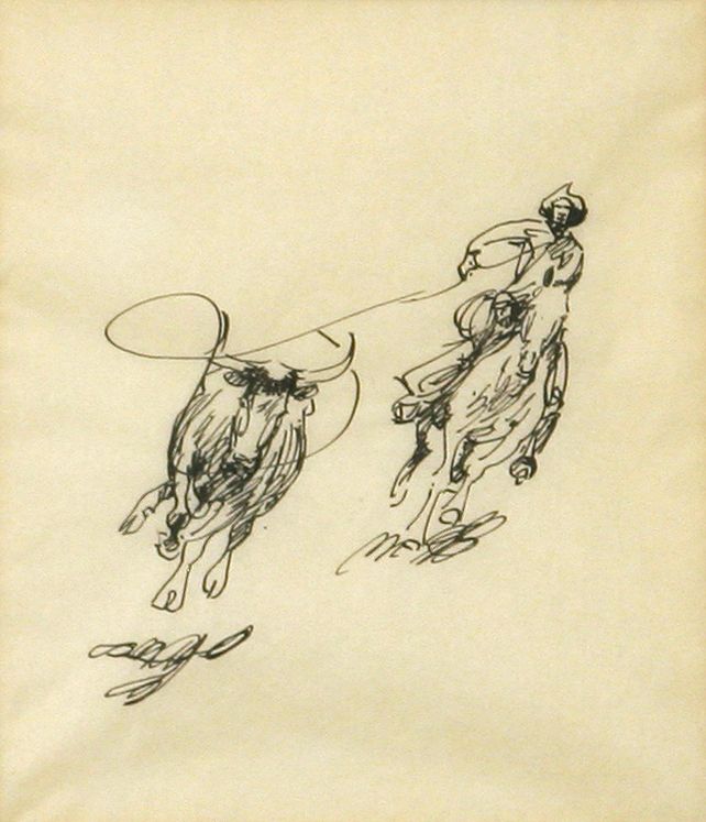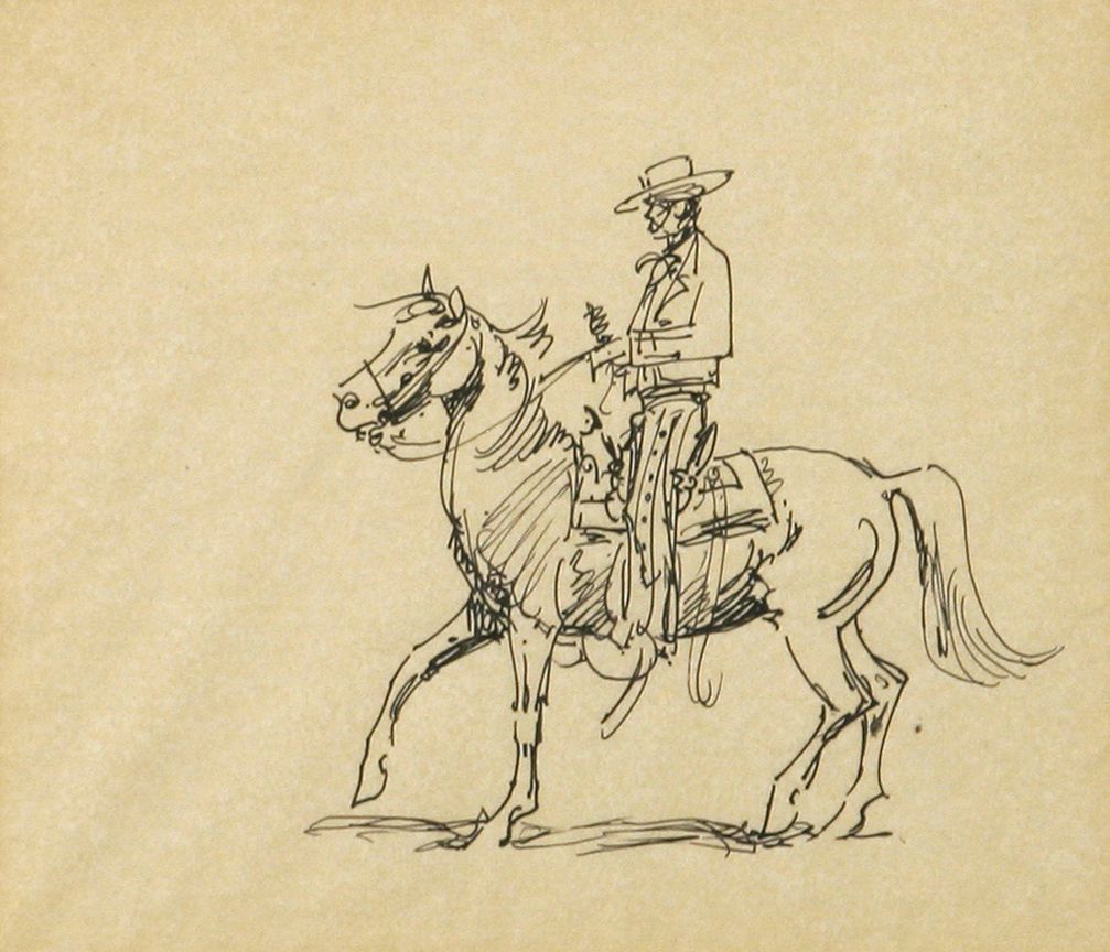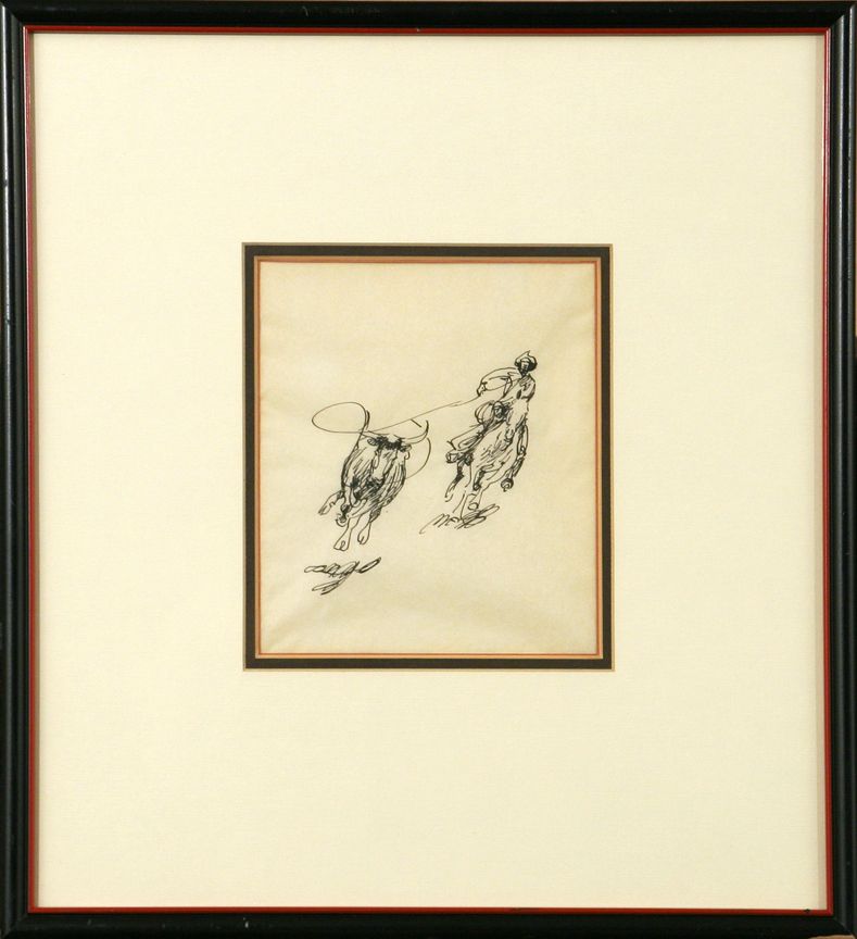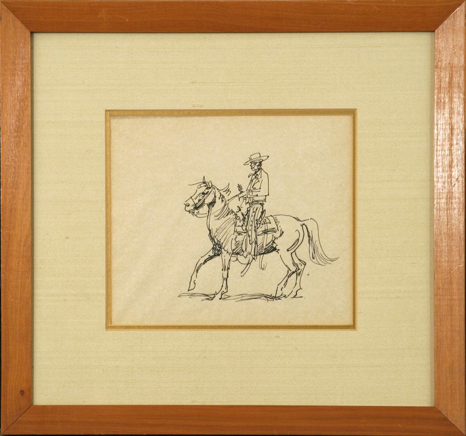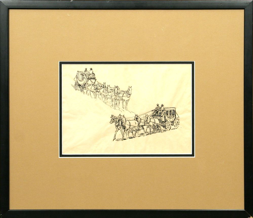 Edward Borein (1872 - 1945). Three pen & inks: Roping A Steer. 6.75" x 5.75" pen & ink. Spanish Rider. 7" x 8" pen & ink. Provenance tag verso: Estate of Irving "Nat" Wills, M.D. Wills wrote the forward to Borein's West & was a friend as well as a collector of Borein's works. Two Concord Coaches. 7" x 10" pen & ink. Includes original letters from Harold G. Davidson for each piece. Provenance: "Spanish Rider" Estate Dr. Irving 'Nat' Wills, Santa Barbara, CA. He wrote the forward to the book 'Borein's West,' published in 1952. Condition reports can be viewed at www.marchinmontana.com/docs/2013CR.pdf