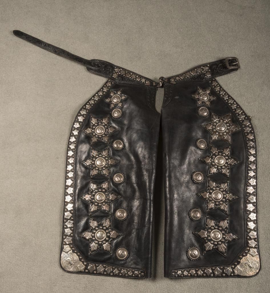 Edward H. Bohlin (1895-1980) Machris Deluxe Model Silver Mounted Parade Chaps 38" long overall with a tapered, floral carved belt, engraved sterling Bohlin buckle and hundreds of sterling silver leaves silver spots. Described in Ed's 1941 catalog as "...very elaborate...having won many prizes at different shows in the silver mounted class." Circa 1930. $7,000-10,000