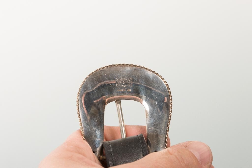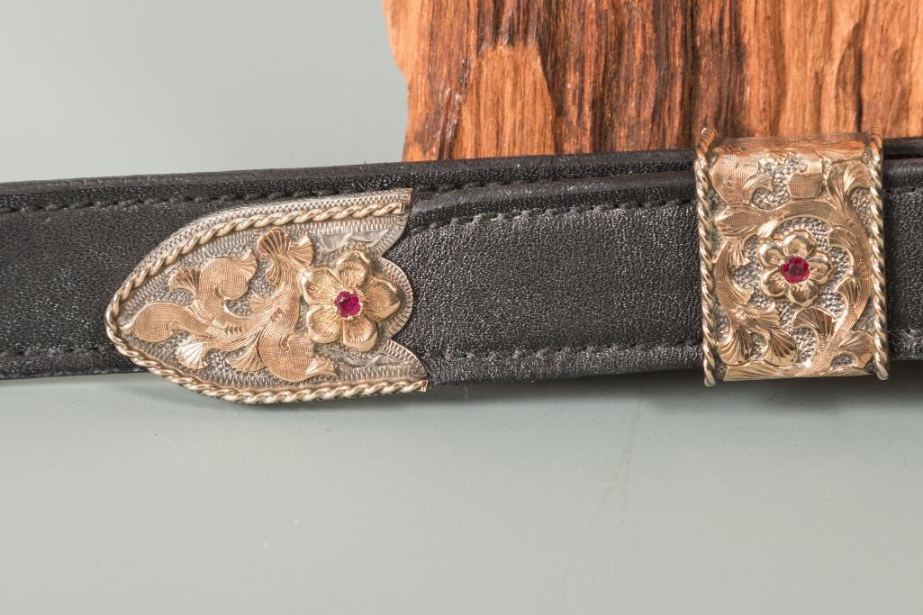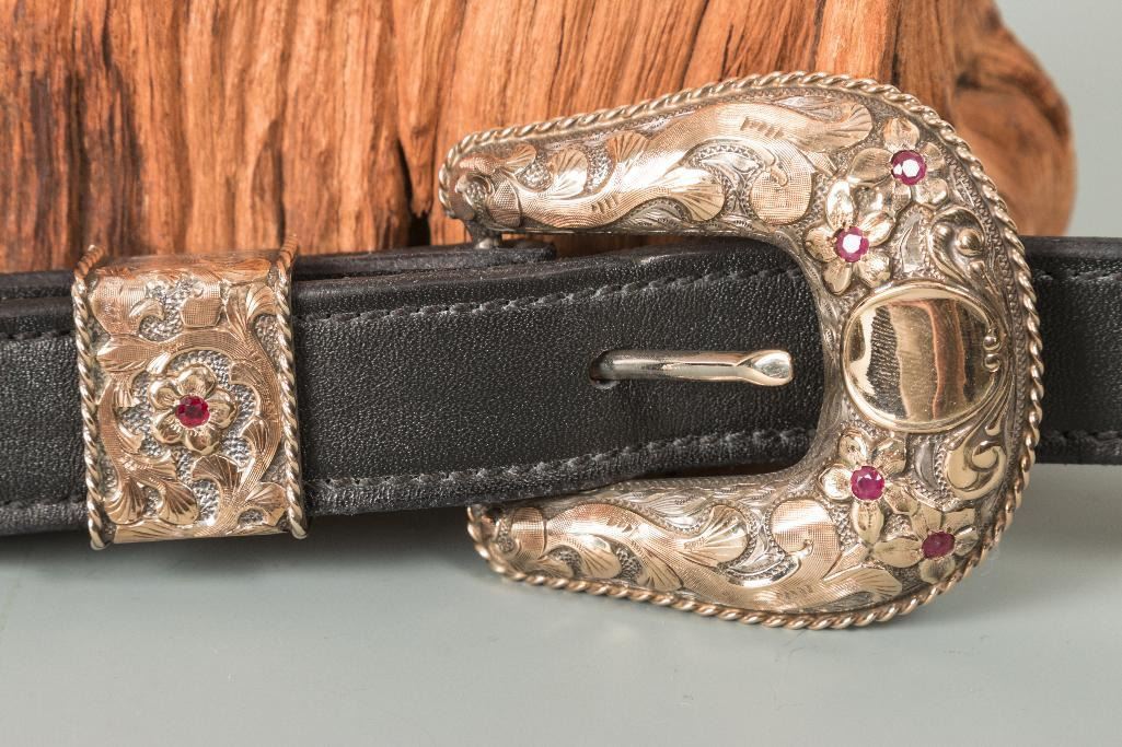Edward H. Bohlin (1895-1980) Sterling Gold Ranger Buckle Set Buckle is 2.25" x 2.5". Model #1173 Ranger set, beautifully engraved and inset with rubies. Circa 1990. $2,000-3,000 Provenance: Ex Bokelman Collection.