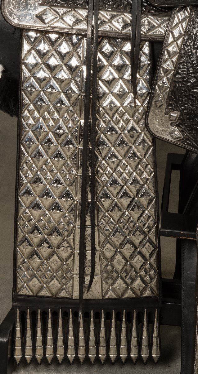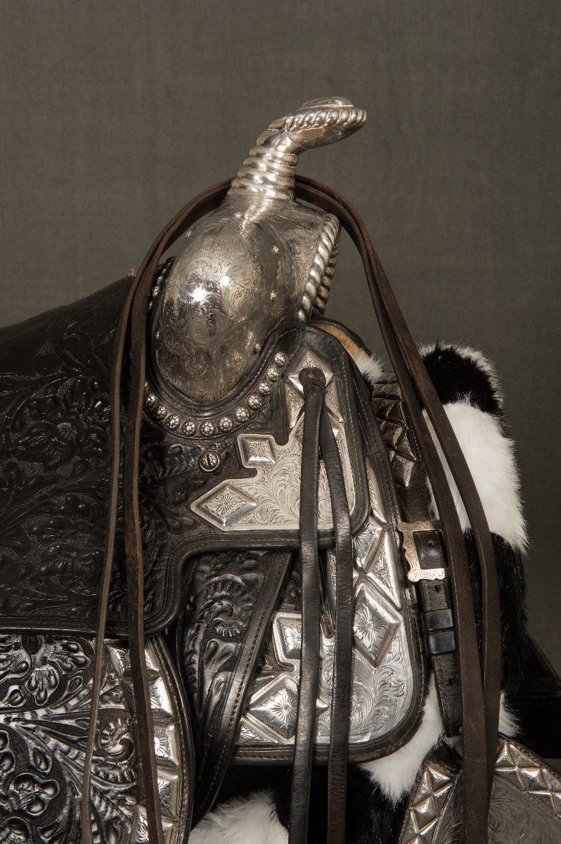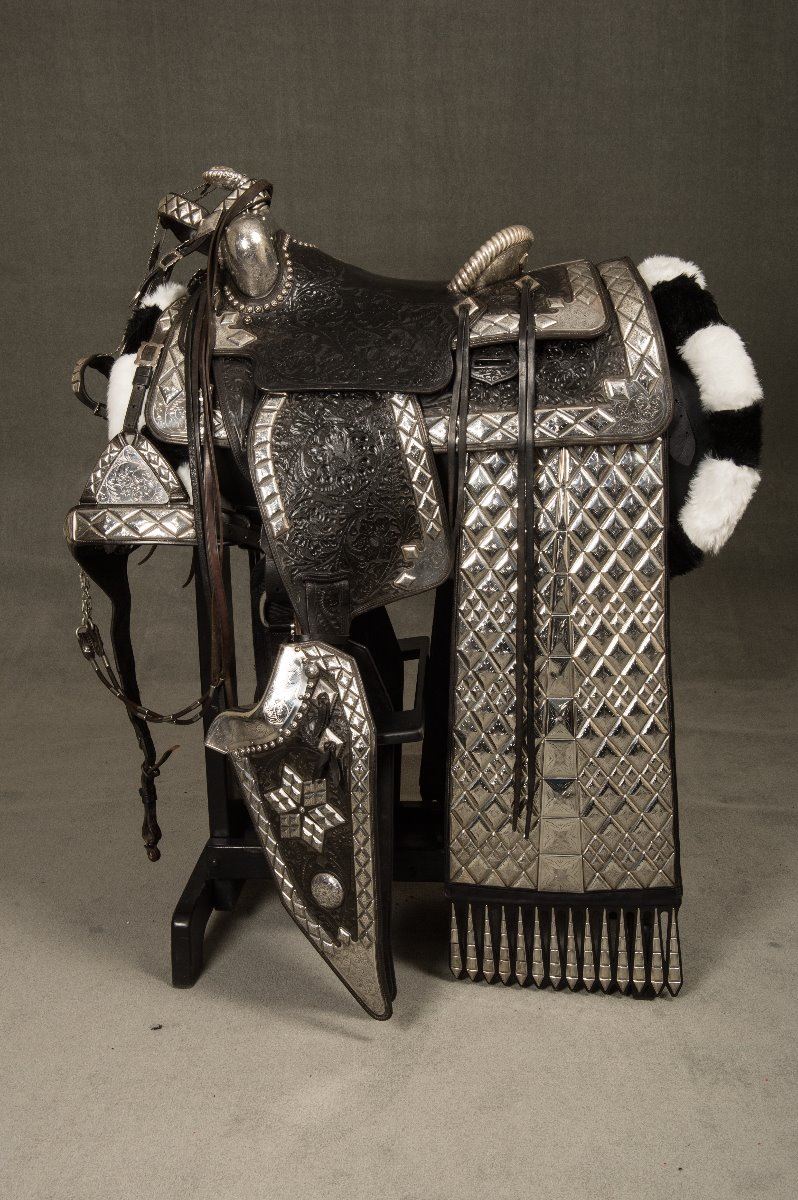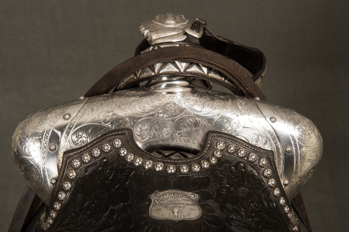 Edward H. Bohlin (1896-1981) Fully Tooled Saddle with Matching Bridle. 15" seat. Heavy sterling silver mounts on saddle along with sterling silver mounted Bohlin bit and serape. Extra long, 24" silver tapaderos. A.T. gold initials (Al Terrence), Los Angeles, CA. modern corona. Circa 1960s.