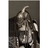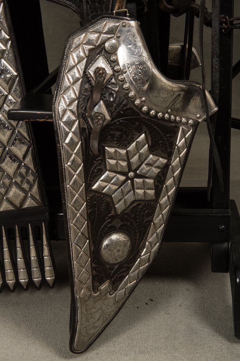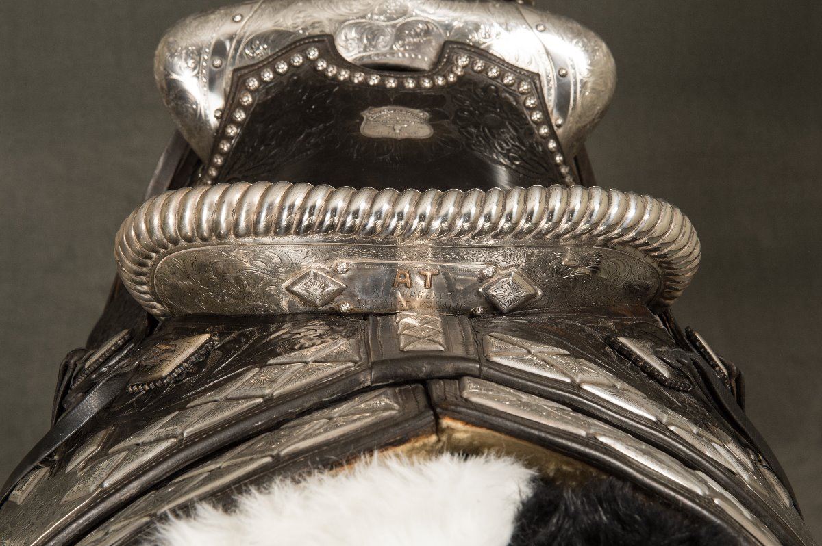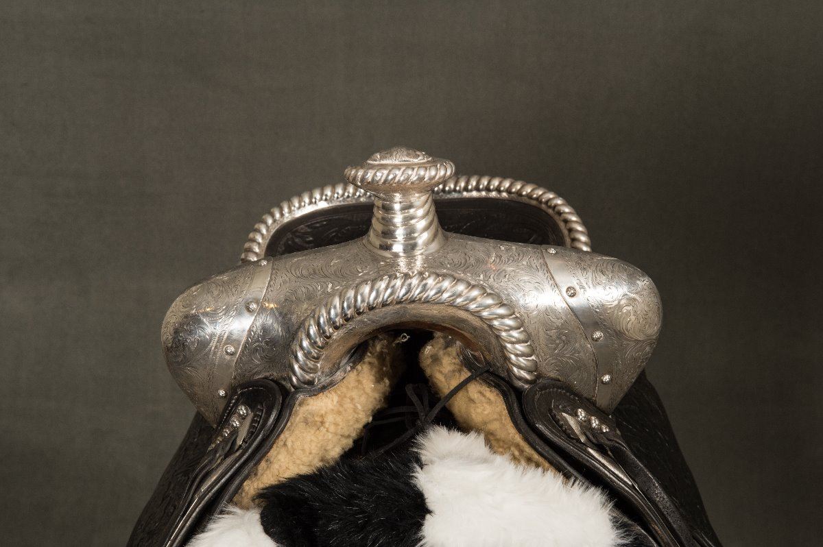 Edward H. Bohlin (1896-1981) Fully Tooled Saddle with Matching Bridle. 15" seat. Heavy sterling silver mounts on saddle along with sterling silver mounted Bohlin bit and serape. Extra long, 24" silver tapaderos. A.T. gold initials (Al Terrence), Los Angeles, CA. modern corona. Circa 1960s.