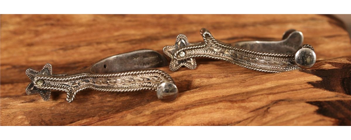 Edward H. Bohlin Miniature Spurs. 2" overall length with 0.5" five-point rowels. Sterling silver with 14K gold diamond decorations. Marked: BOHLINMADE STERLING 14K (football mark). Circa 1980s.