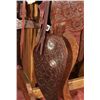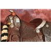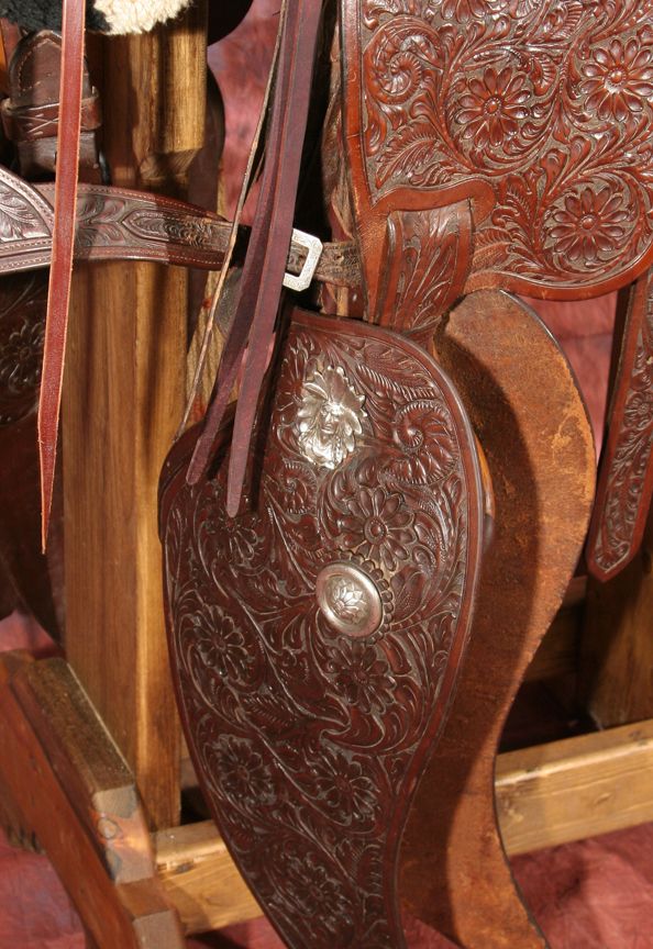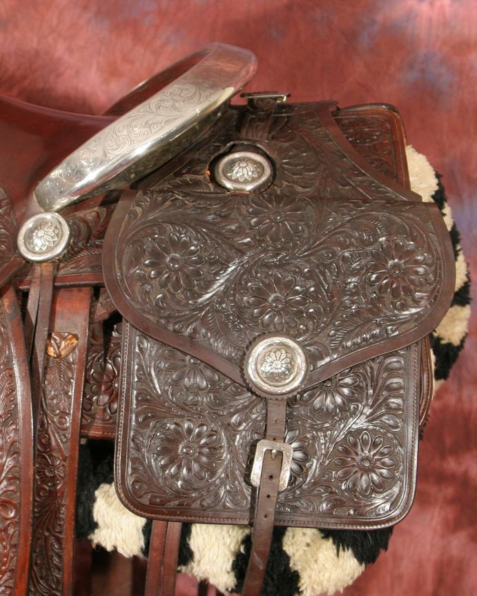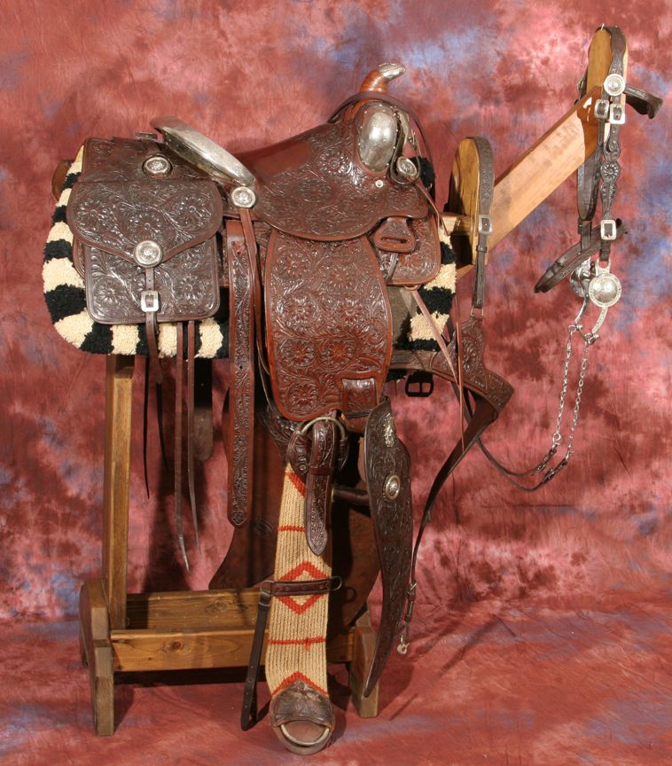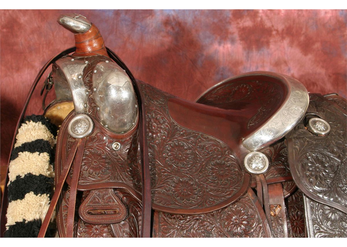 Edward H. Bohlin Silver Mounted Parade Ensemble. Exceptionally tooled brown leather with classically styled Bohlin silver. Includes matching bridle, martingale, saddlebags, cinch & corona. Engraved cantle plate: Rudolph C. J. Fritsch, Miami Beach, FL. 15" seat with a Cheyenne roll cantle. Circa 1950s. Provenance: Collection of Dr. Delwin & Karen Bokelman, PA., & pictured in their book Precious Dreams, page 68. Condition reports can be viewed at www.marchinmontana.com/docs/2013CR.pdf
