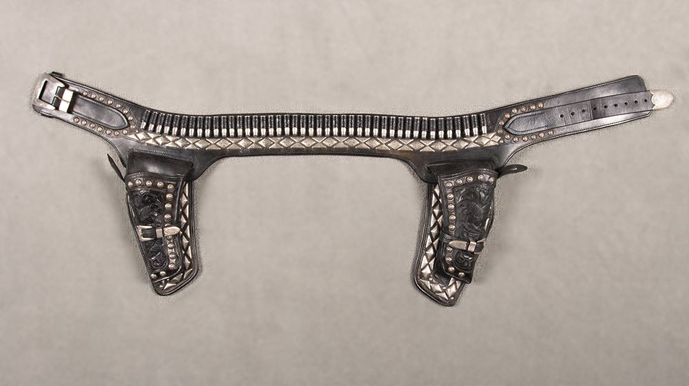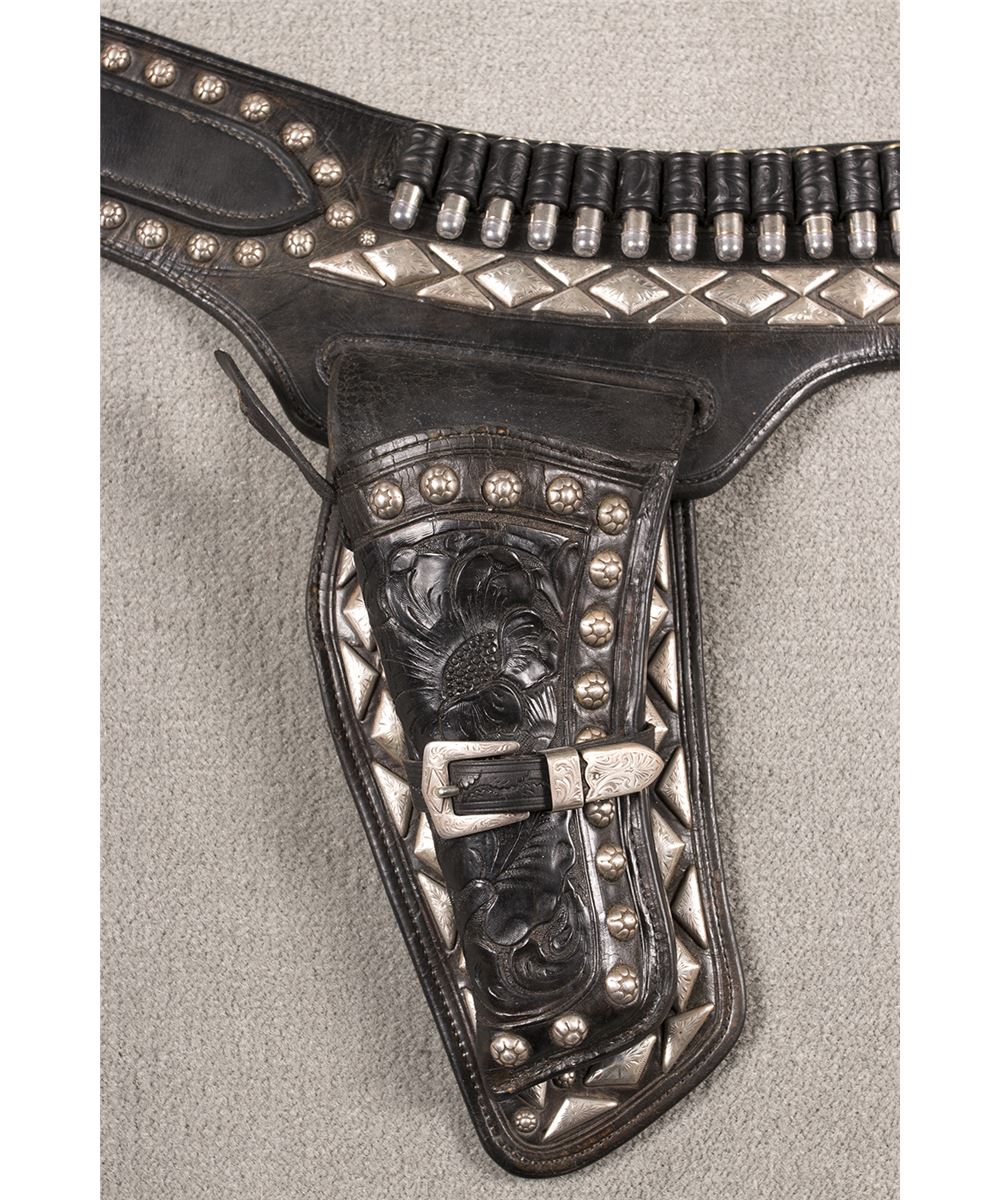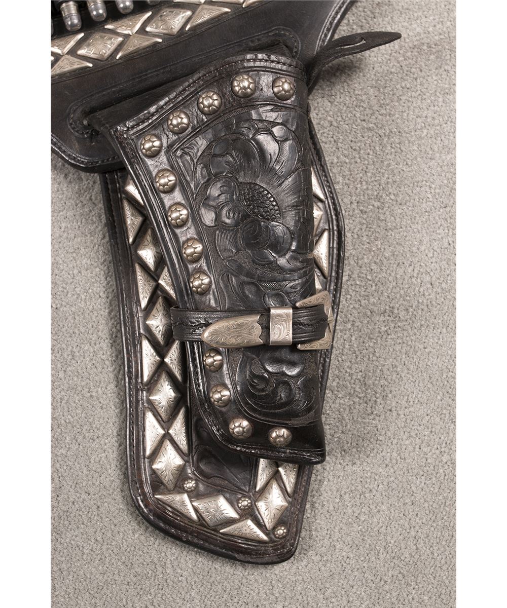 Tooled and carved leather holster rig for pair of Colt single action revolvers. Heavily mounted with silver triangles and diamonds in the Dick Dickson style. Belt is 40" long. Bohlin silver belt buckle has "G" engraved on it. Circa 1950s.