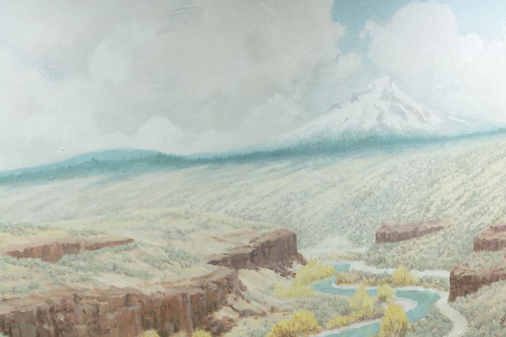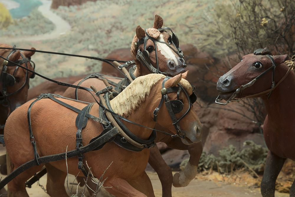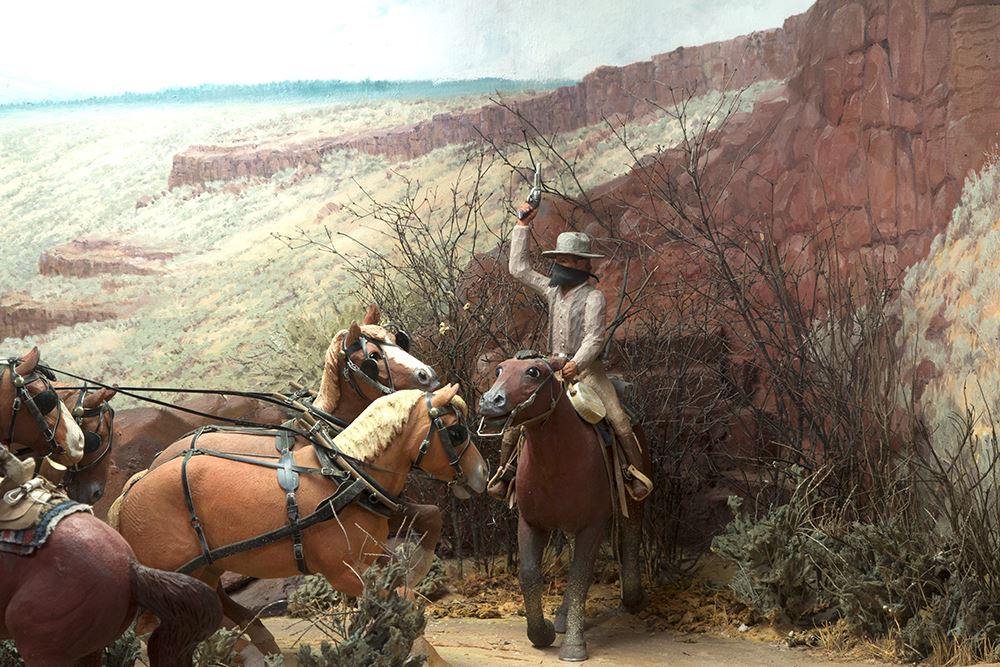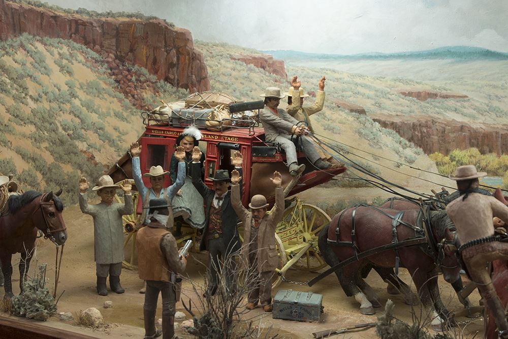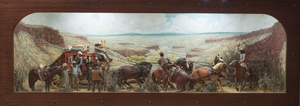 Edward Quigley (1895-1984). The Hold-Up. 88" x 32" x 34" carved wood and painted diorama inside an illuminated wooden display case. One of Quigley's masterpieces with 9 horses and 10 human figures depicting a Wells Fargo Overland Stage hold up by three masked and armed robbers. The locale is near Prineville, Oregon near the Deschutes River. The stagecoach is hand-crafted as well as the figures and animals. The custom display case, including a fully-painted backdrop and authentic terrain, was added later. It has been on loan to the Museum of Western Art and Artifacts in Klamath Falls, Oregon for many years. Completed in 1961 and pictured on page 153 of the book, Ed Quigley, Western Artist by Carl Gohs.
