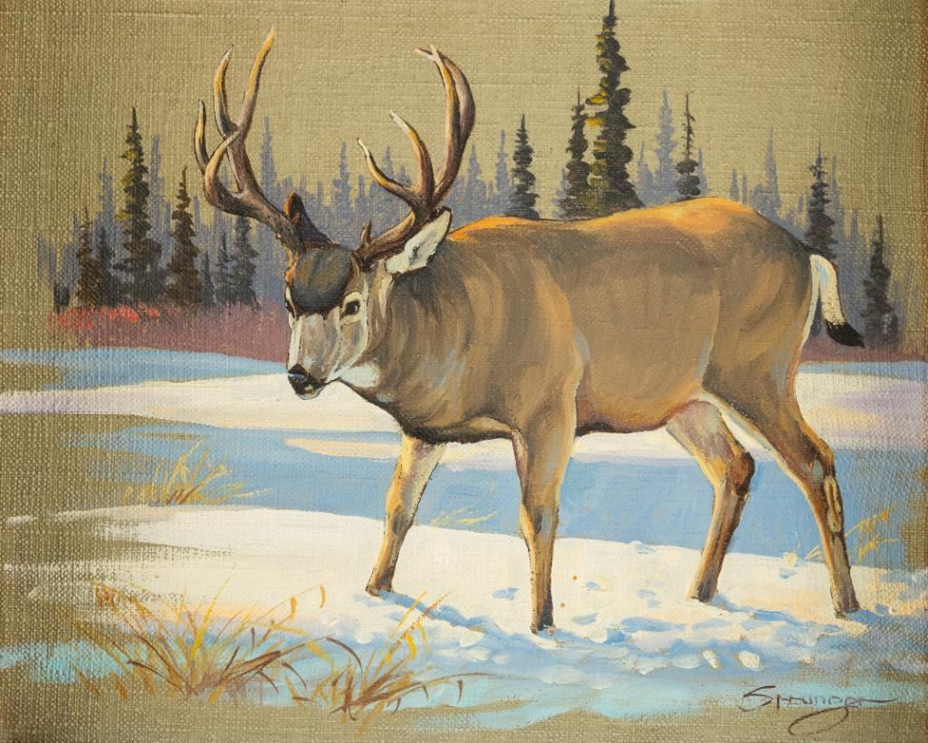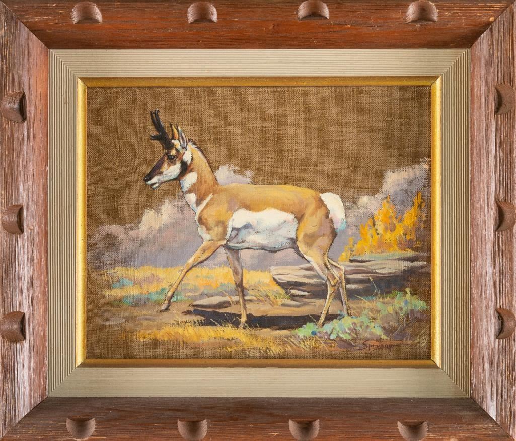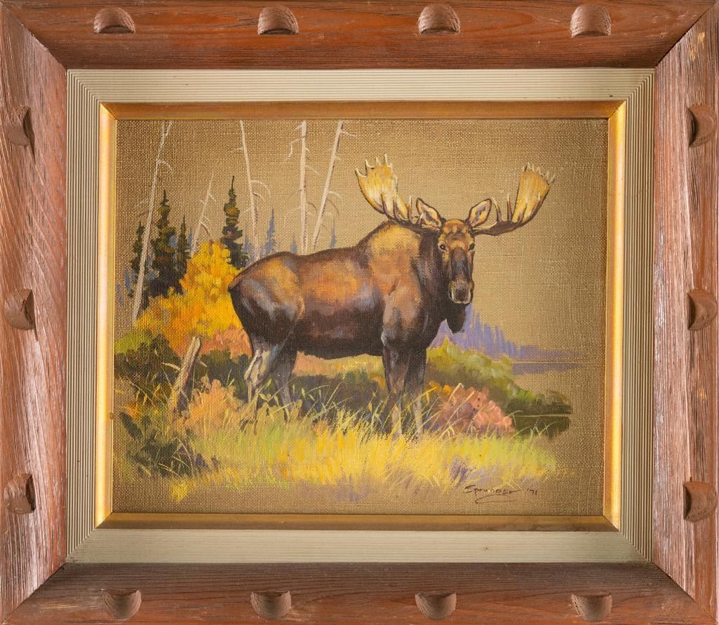 Elmer Sprunger (1919-2007) Group of 5 small oils: 1) Moose 2) Sheep 3) Mule Deer 4) Pronghorn 5) Bison Each 8" x 10", each signed lower right $1,000-1,500 Provenance: Private Collection, Whitefish, MT.