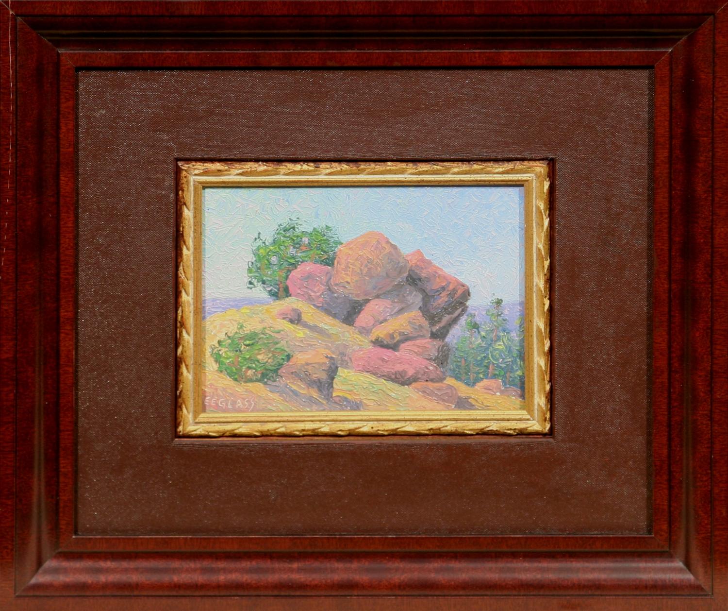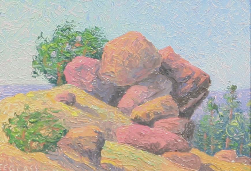 Emerson Everett Glass (1916-1987). Pair of oils on board. (1) Rattle Snake Rock. 6" x 7½", signed lower left. (2) Moose Haven. 12" x 16", signed lower right. (est $1,500-2,500) Condition Report: Black lights clean. Both newly framed