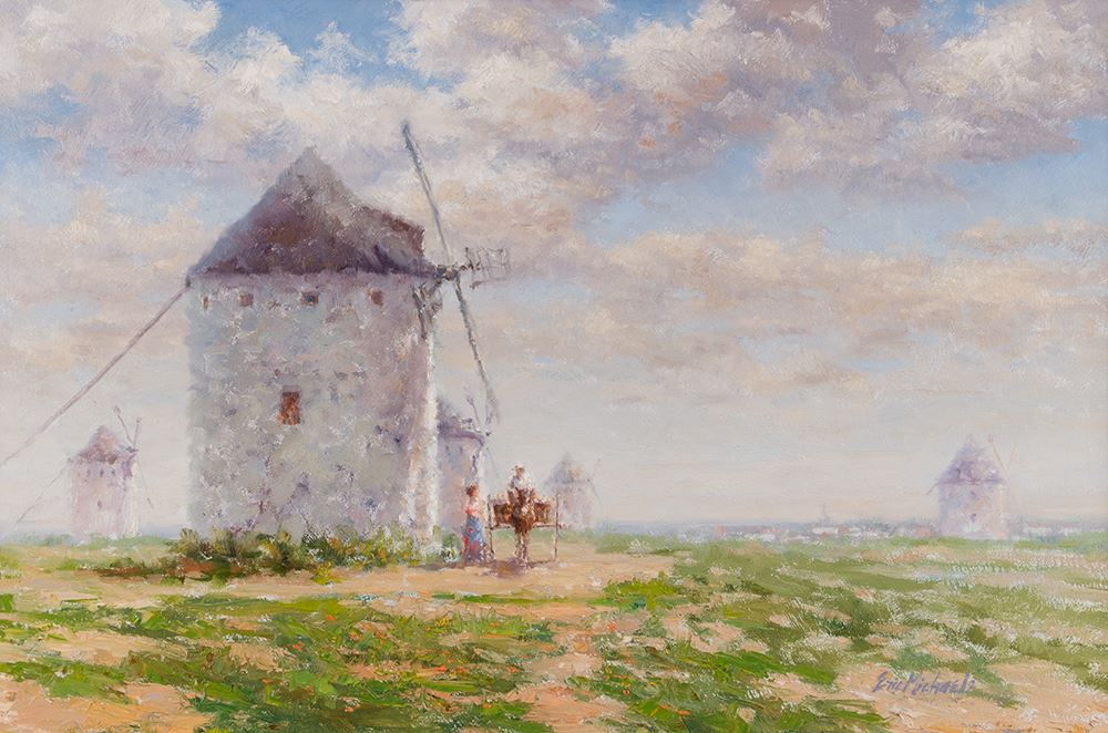 Eric Michaels (1949 - ). Under La Mancha Skies. 20" x 30" oil on board. Signed lower right: Eric Michaels.