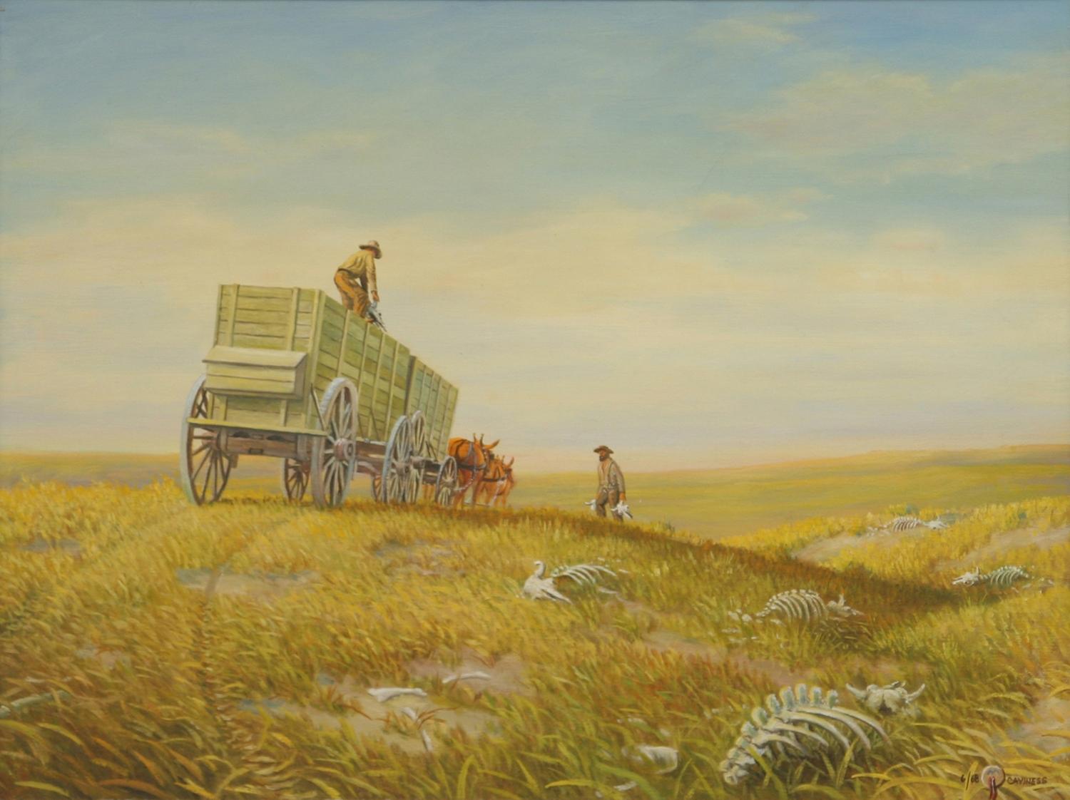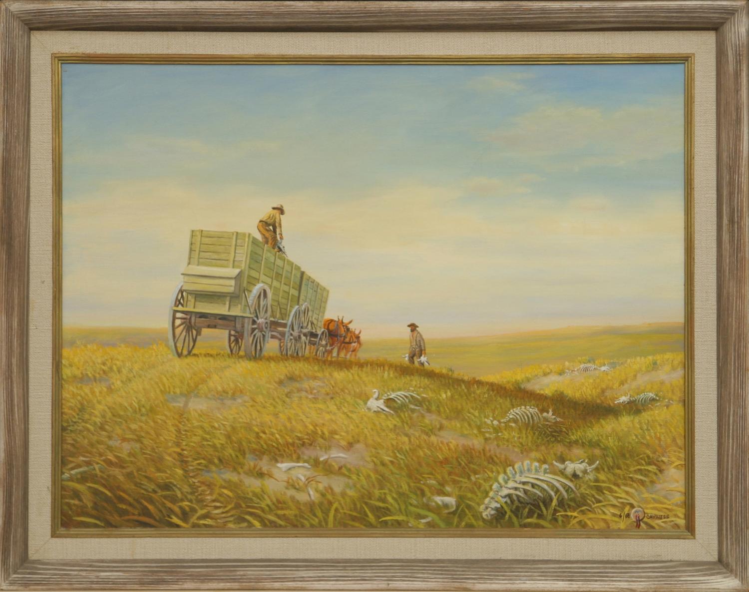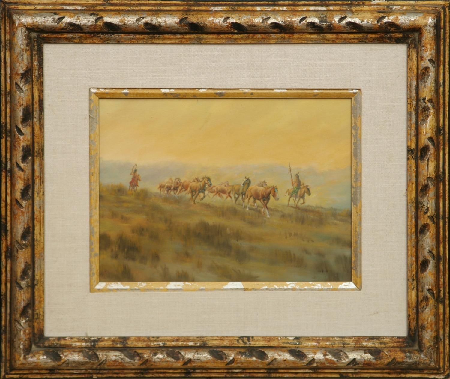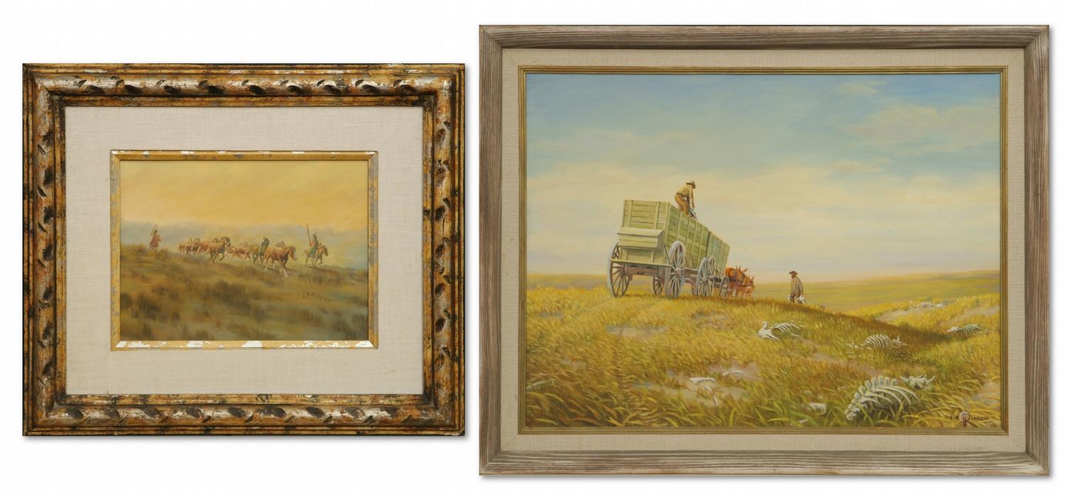 Ernie Caviness (20th century). Pair of Oil Paintings. (1) Indian Horse Capture. 9" x 12". signed lower right. (2) Gathering Buffalo Bones. 18" x 24". signed and dated 68 lower right. (est $800-1,200). Provenance: Austin Estate, Anchorage, AK Condition Report: Black lights clean