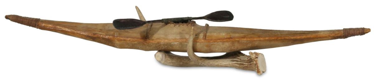 Eskimo Kayak. 22" long. Hide over wood frame. Original double oar. Fine condition. Early 20th century. (est $400-500)