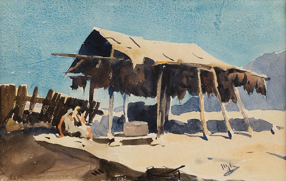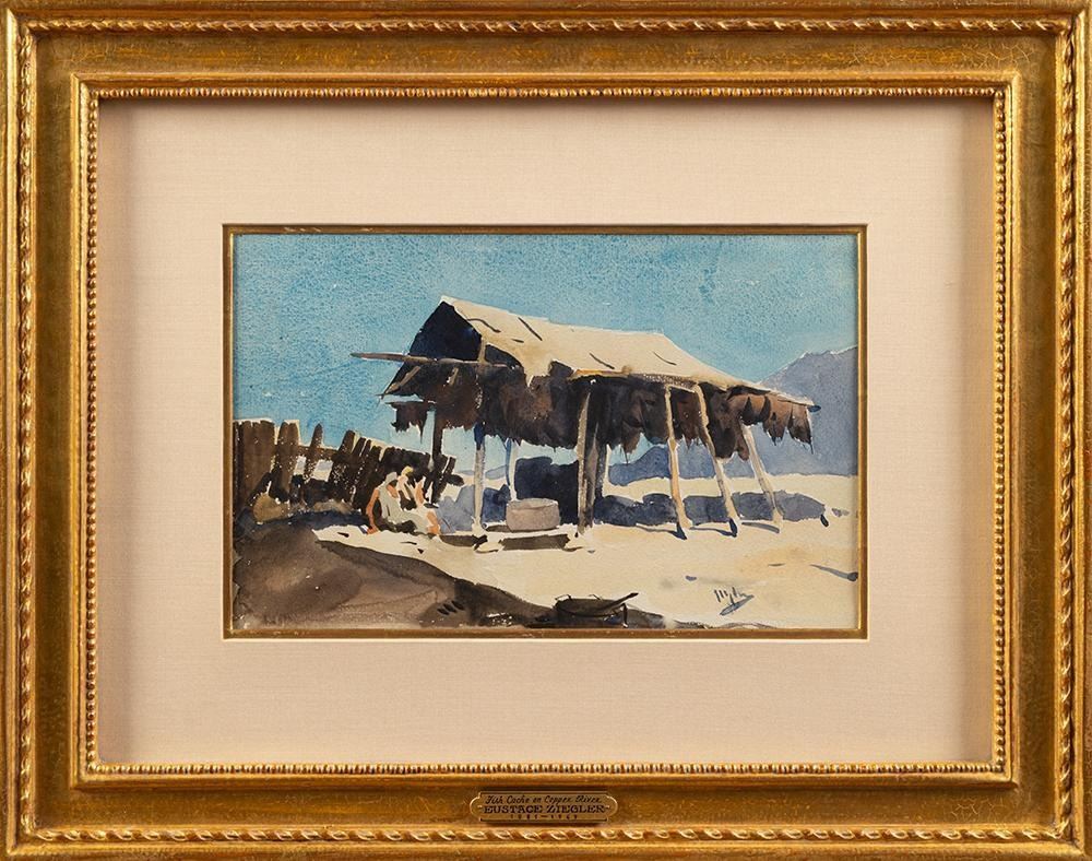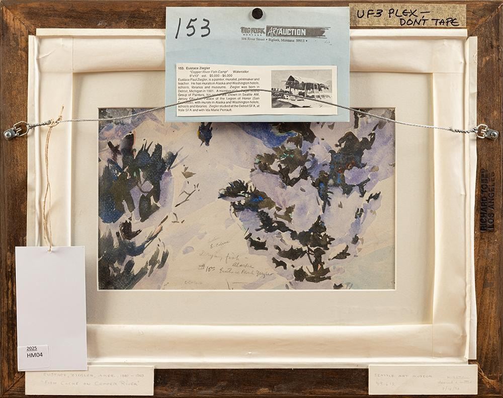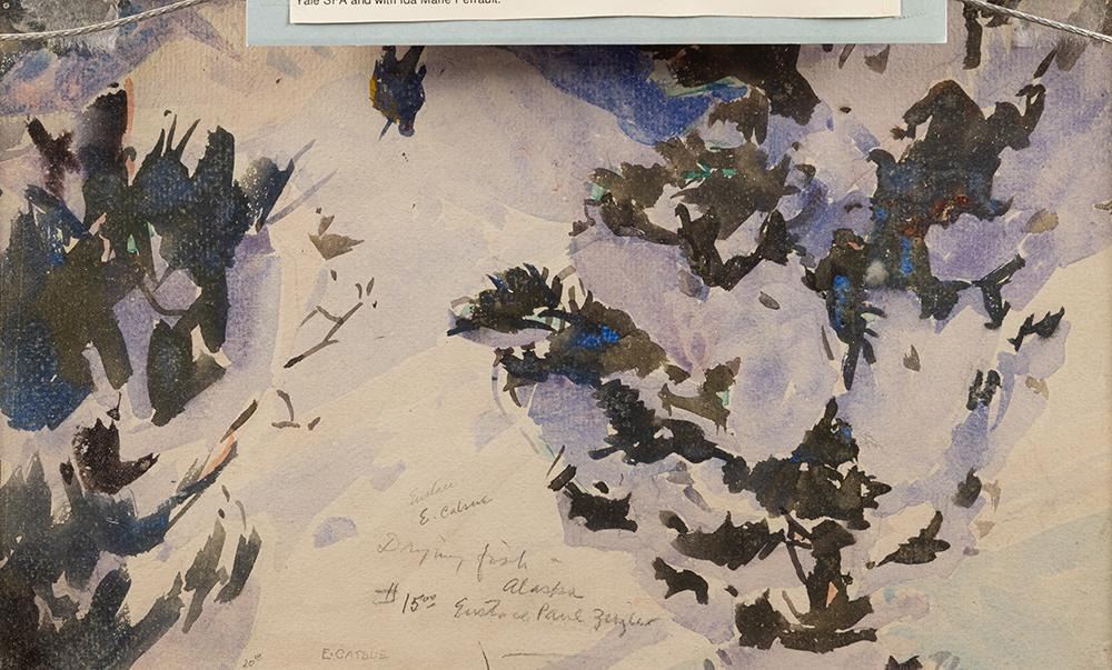 Verso: Painting with title Drying Fish, Alaska. Signed, artist biography and tag from big Fork Art Auction, Bigfork, MT.