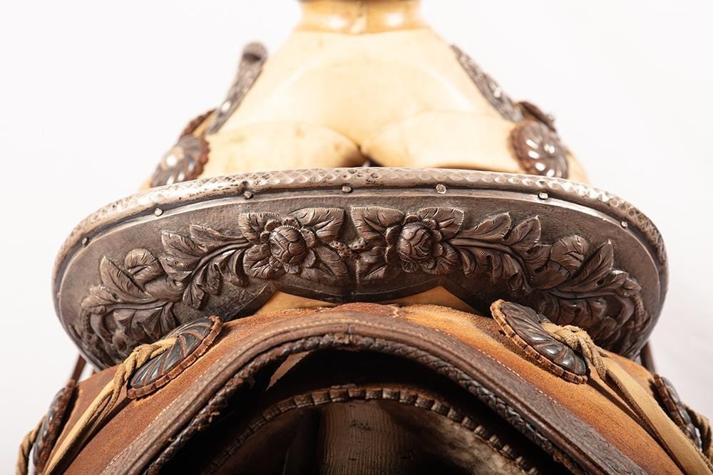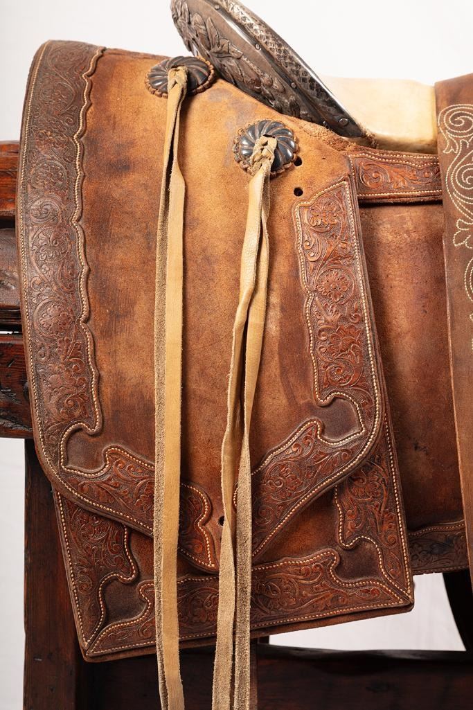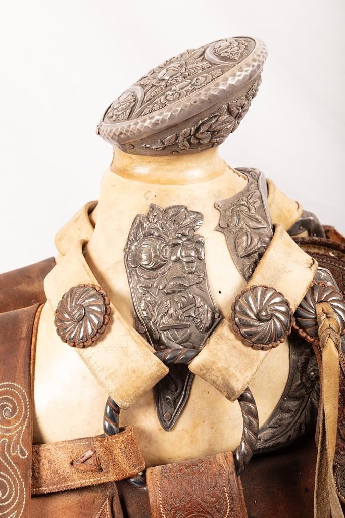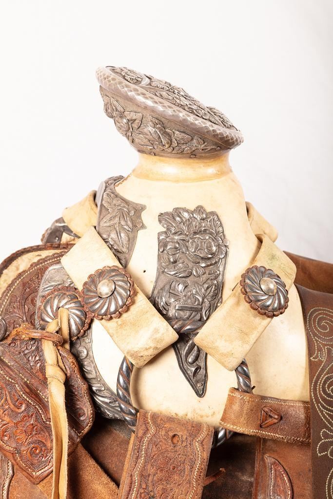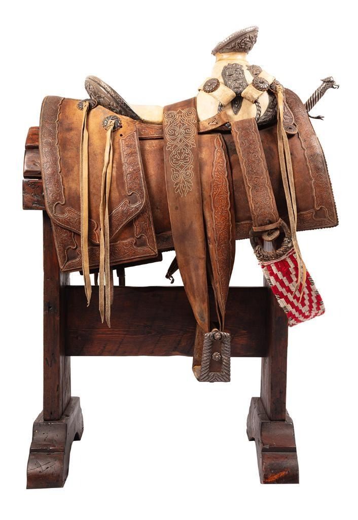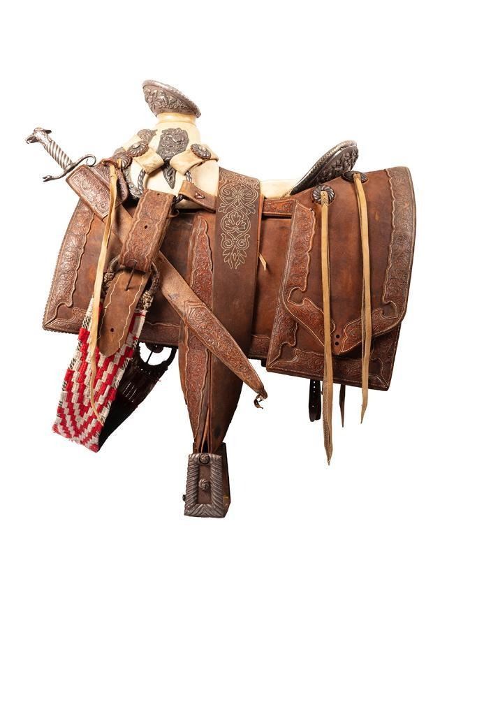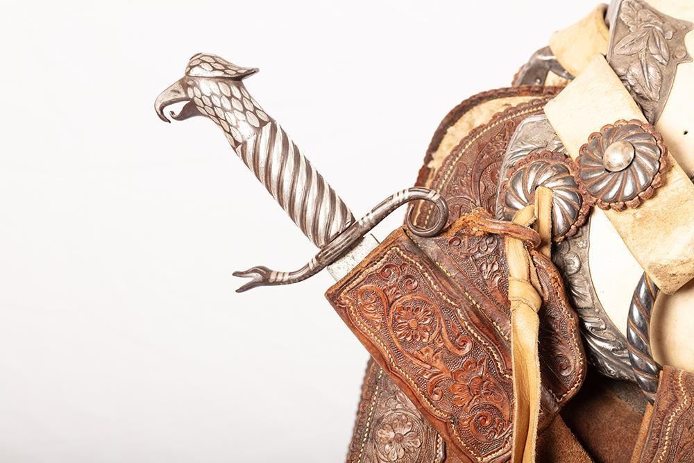 Rawhide seat and tree. Silver sword in scabbard with an eagle and snake effigy. Sword embossed with desert vaquero scene and inscription: Hecho en Mexico for Emanuel Valencia. On other side: "Cuidate de los toros, por Deladte; de las molas por detras; de los perros por los lados y de los medicos, curas y abogados por delate por detras y por los lados. ING Antonio Gutierrez, Prieto." Translated to: Beware of the bulls ahead, of the mules behind, of the dogs on the side, and of the doctors, priests and lawyers in front, behind and on the sides."