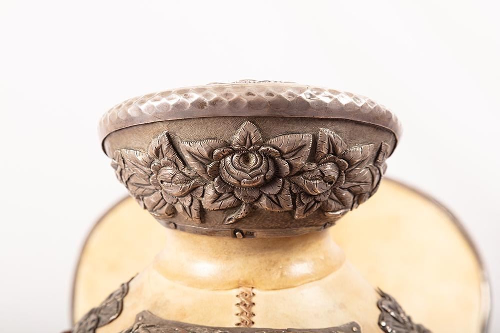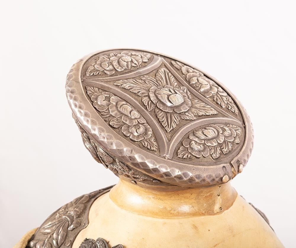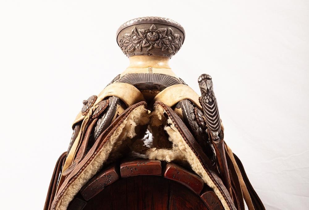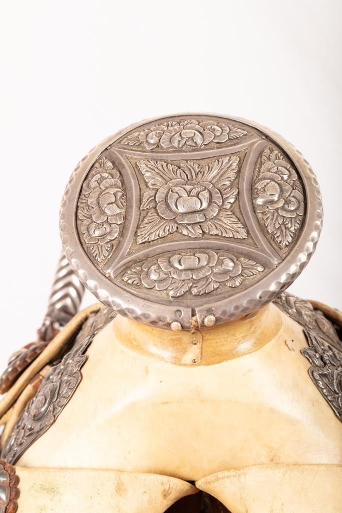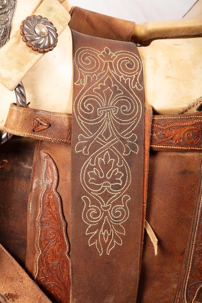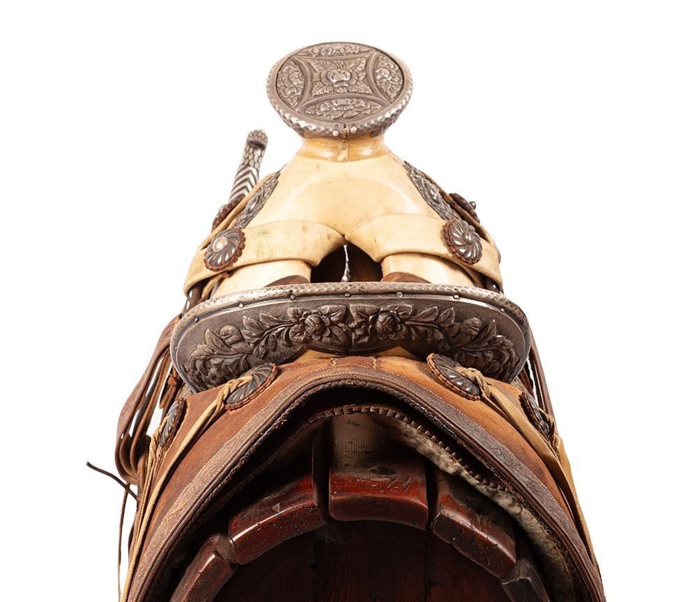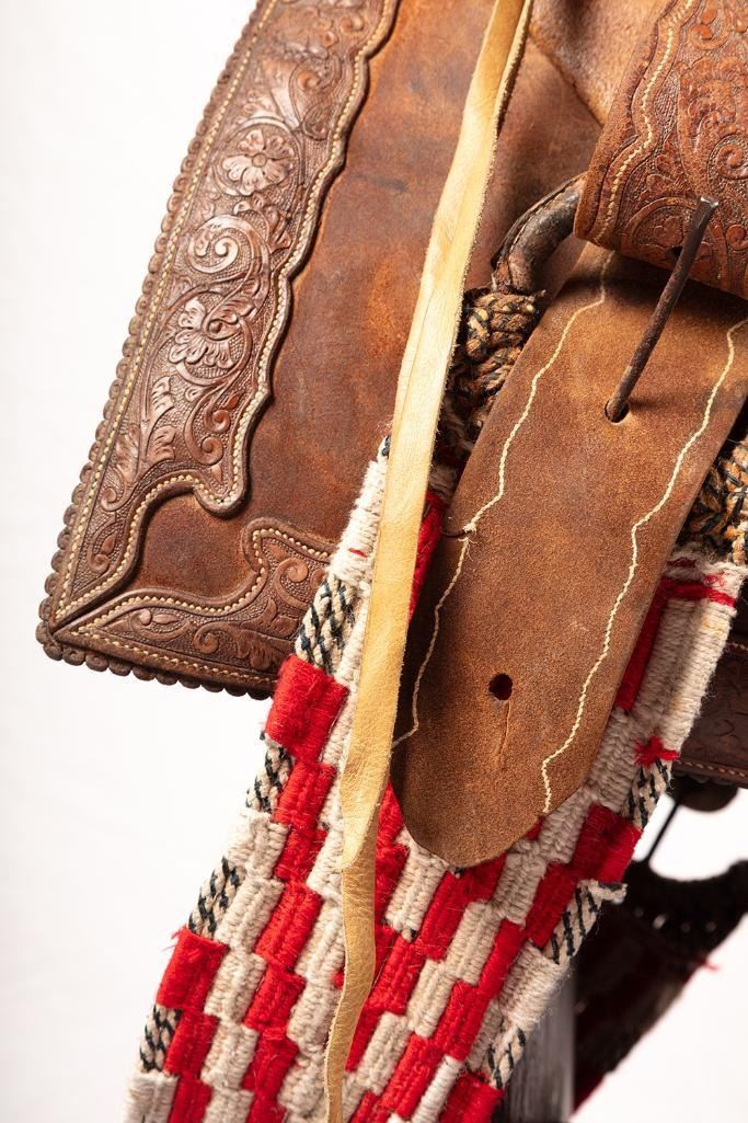 Rawhide seat and tree. Silver sword in scabbard with an eagle and snake effigy. Sword embossed with desert vaquero scene and inscription: Hecho en Mexico for Emanuel Valencia. On other side: "Cuidate de los toros, por Deladte; de las molas por detras; de los perros por los lados y de los medicos, curas y abogados por delate por detras y por los lados. ING Antonio Gutierrez, Prieto." Translated to: Beware of the bulls ahead, of the mules behind, of the dogs on the side, and of the doctors, priests and lawyers in front, behind and on the sides."