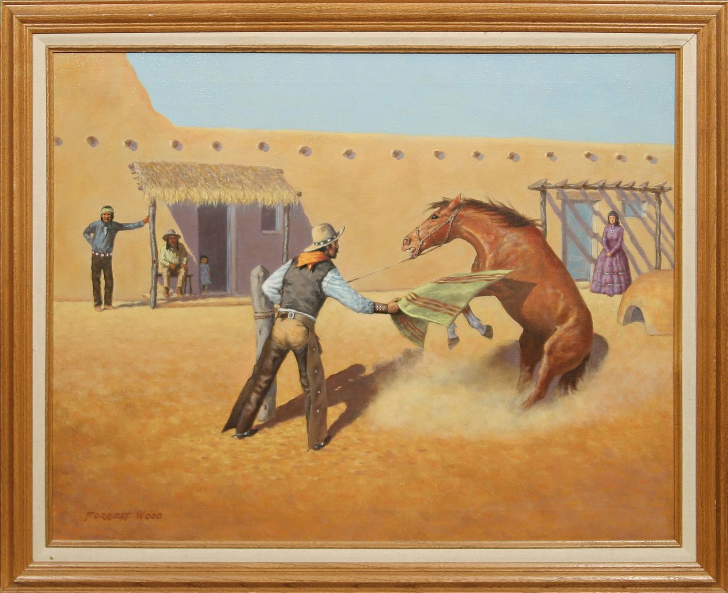 Forrest Wood (20th century). Sackin' Out. 22" x 28" oil on canvas. Signed lower left. (est $500-1,000) Condition Report: Black lights clean. In oak frame
