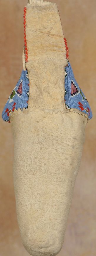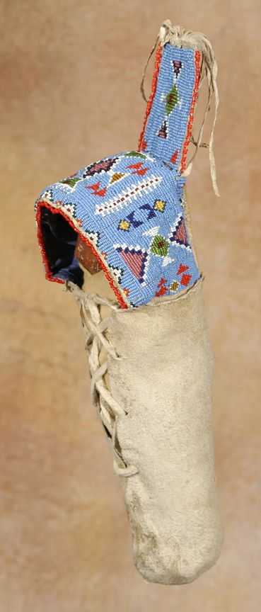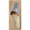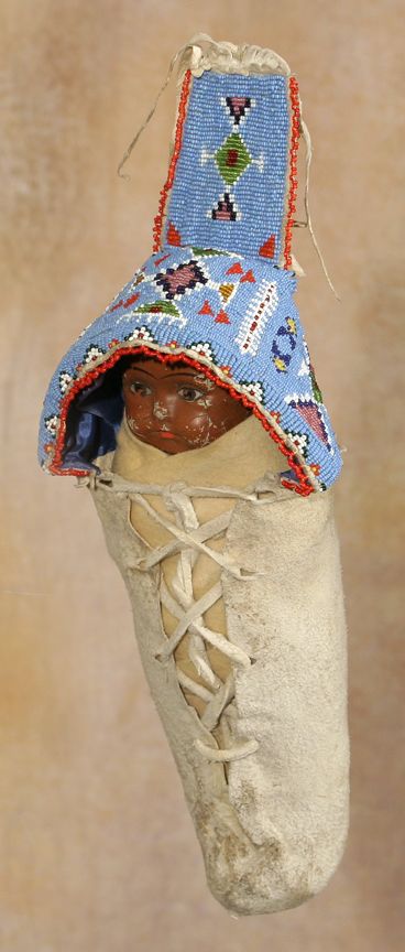 Fort Peck Sioux or Assiniboine Doll Cradle. 12" x 5" cradle (18" with tab & fringe). Hand sewn on old hide with vintage doll. Wonderfully beaded designs on a parfleche upper with silk lining. Beadwork is sewn directly onto hide with lane stitching. Old doll, rare to have a brown pigment on the face. Late 19th century. Condition reports can be viewed at www.marchinmontana.com/docs/2013CR.pdf