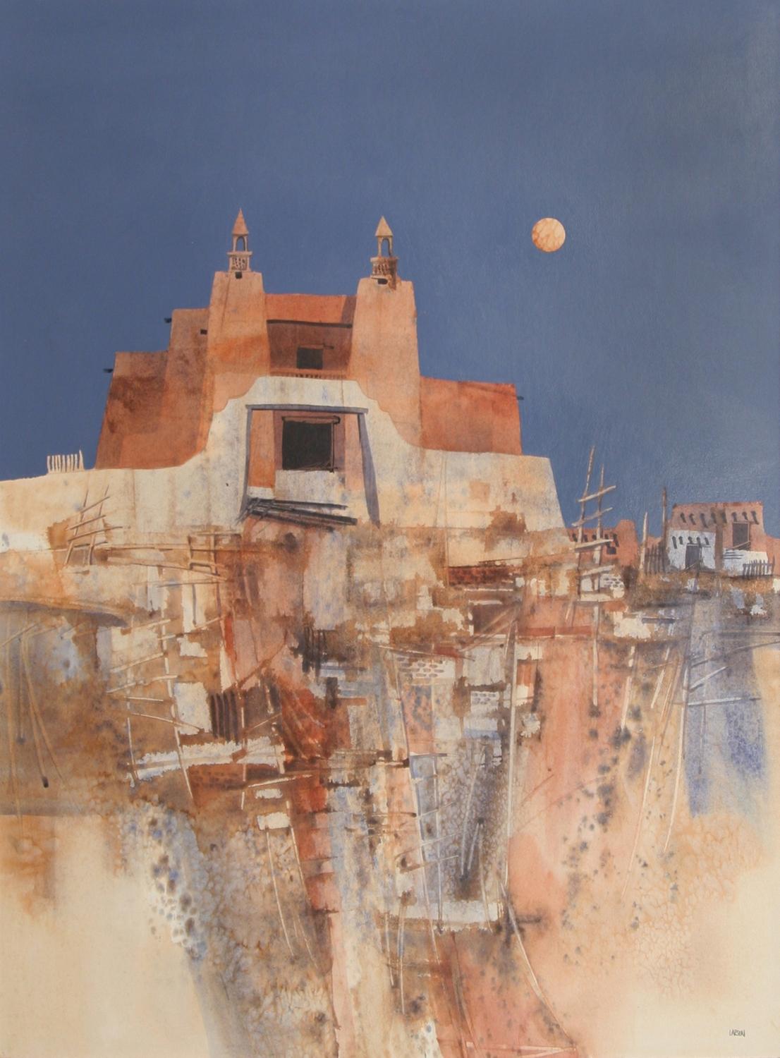 Fran Larsen (b. 1937). Las Trampas Moon View. 40" x 30" mixed media. signed lower right. (est $1,000-1,500) Condition Report: Black lights clean. In older style frame