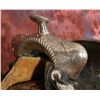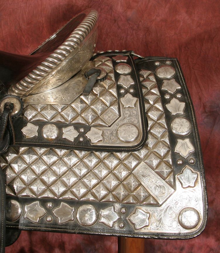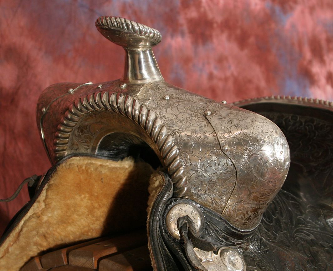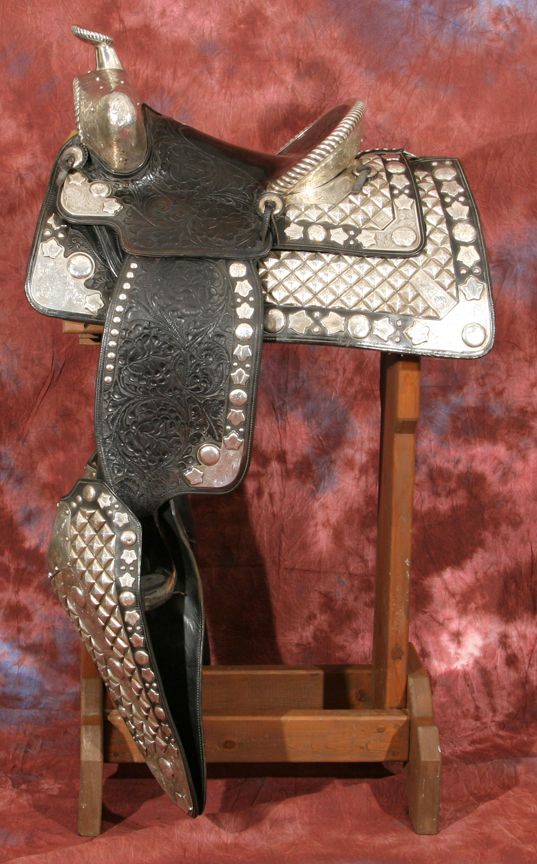 Frankie Paul Silver Mounted Parade Saddle. Made for W. R. Tate in the late 1930s/early 1940s. Finely tooled black leather. Virtually covered with Bohlin silver over a Miles City or Ellensburg tree. Latigo is included, no cinch. A letter from Bob Brown, dated 1992, is included which states that he created the maple leaf conchos in 1934. Provenance: Collection of Dr. Delwin & Karen Bokelman, PA., & pictured in their book Precious Dreams, page 57. Condition reports can be viewed at www.marchinmontana.com/docs/2013CR.pdf