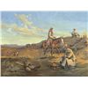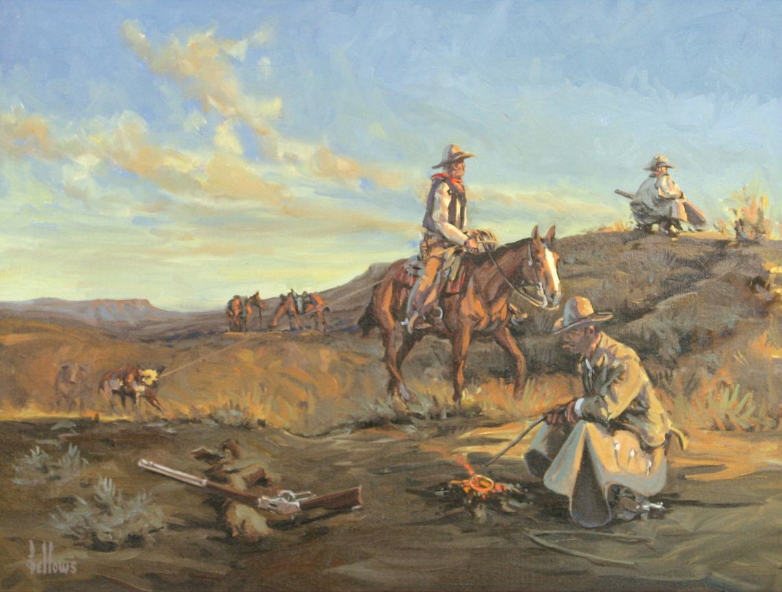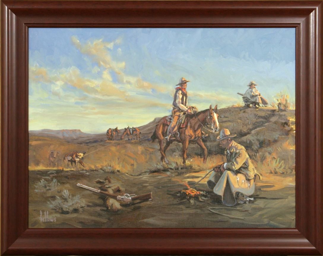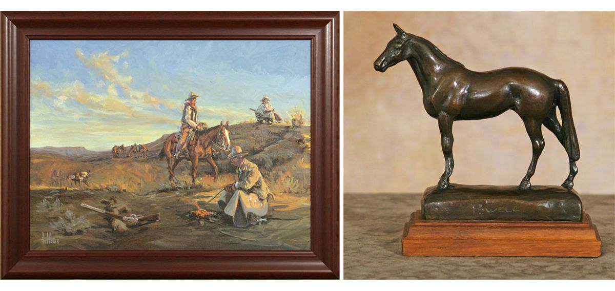 Fred Fellows (1934 - ) CA. When The Winchester & The Cinch Ring Were Tools Of The Trade. 18" x 24" oil on canvas. Signed lower left: fellows. Together with Ace Powell (1912 - 1978). Bertsche's Horse. 5.75" x 6" x 1.75" bronze. Inscribed [ace card] POWELL, © REX BRENEMAN 27/30 1978. Condition reports can be viewed at www.marchinmontana.com/docs/2013CR.pdf
