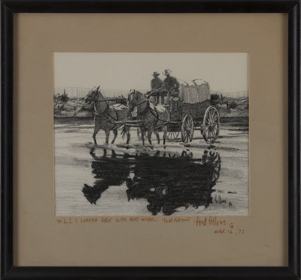 Fred Fellows (1934 - ). Afternoon Crossing. 9" x 12" oil on board. Signed lower left: fellows CA. Together with 9" x 10 ½" graphite drawing. Signed lower right: fellows CA. Inscribed on mat: TO LJ AND LORETTA BIBLE WITH BEST WISHES…YOUR FRIEND FRED FELLOWS CA MAR. 16, 73.