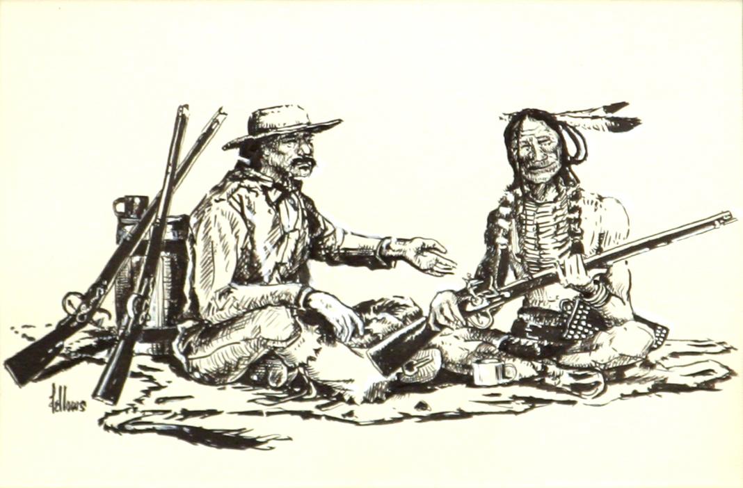 Fred Fellows (b. 1934). (1) Traders. 6" x 8 ¾" pen and ink drawing. signed lower left. (2) Owl on Skull. Bronze, #94/100. 6" x 7" x 7". (est $800-1,200). Provenance: Estate of Paul & Doris Masa, Kalispell, MT. Condition Report: Fine condition