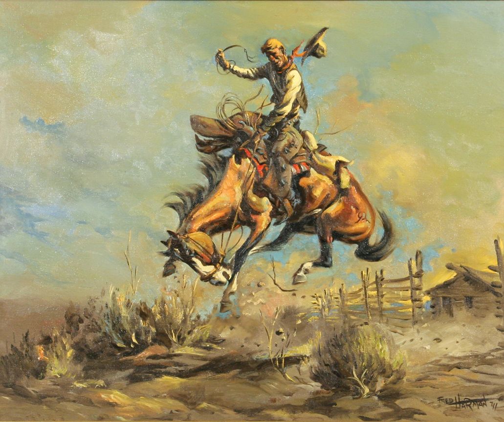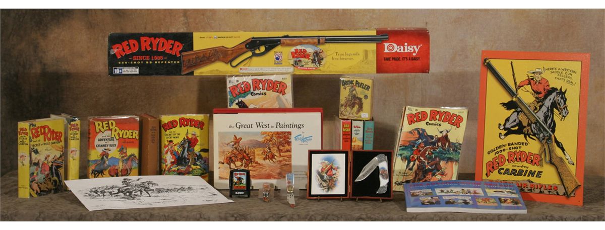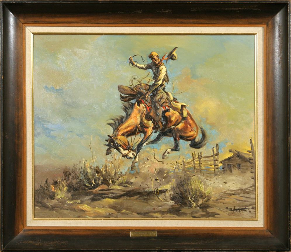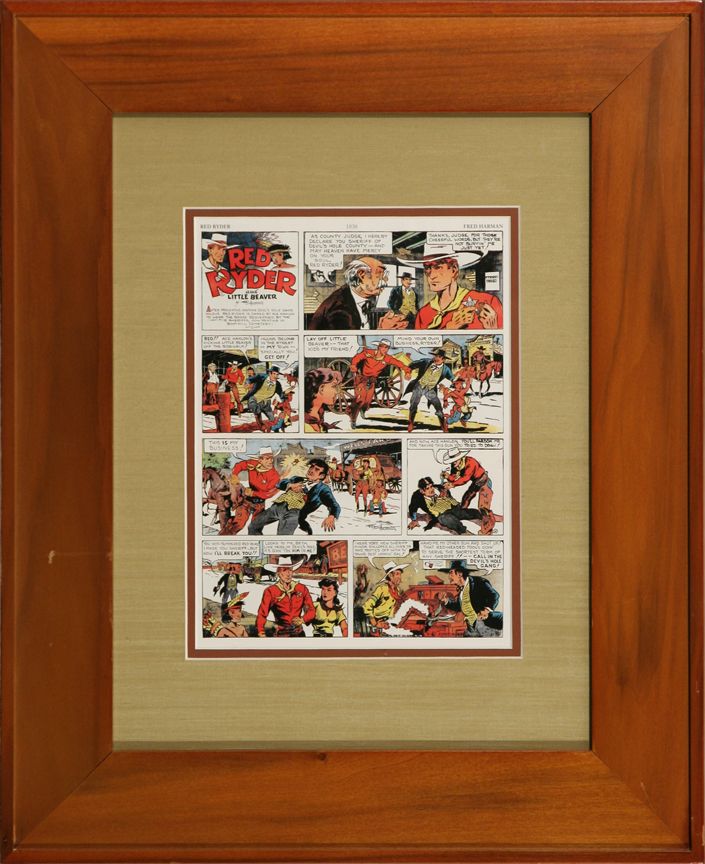 Fred Harman (1902 - 1982) CA. Rainbowin'. 20" x 24" oil on canvas. Signed lower right: FRED HARMAN 41. Museum Tags verso: Colorado Springs Fine Art Center, Harmsen Museum of Art & The Colorado Historical Society. Accompanying this lot: two 6" x 4.5" ink sketches (framed together), 1938 framed Red Ryder comic strip, Daisy Red Ryder BB Gun in box, eight Red Ryder hardcover books with dust jackets, one Bronc Peeler book, various comic books, Issue #14 of The Westerner, The Adventurous Decade, Comic Strips in the Thirties, The Great West in Paintings by Fred Harman, Red Ryder Air Rifles tin sign, Red Ryder Zippo lighter & three Red Ryder pocket knives. Condition reports can be viewed at www.marchinmontana.com/docs/2013CR.pdf