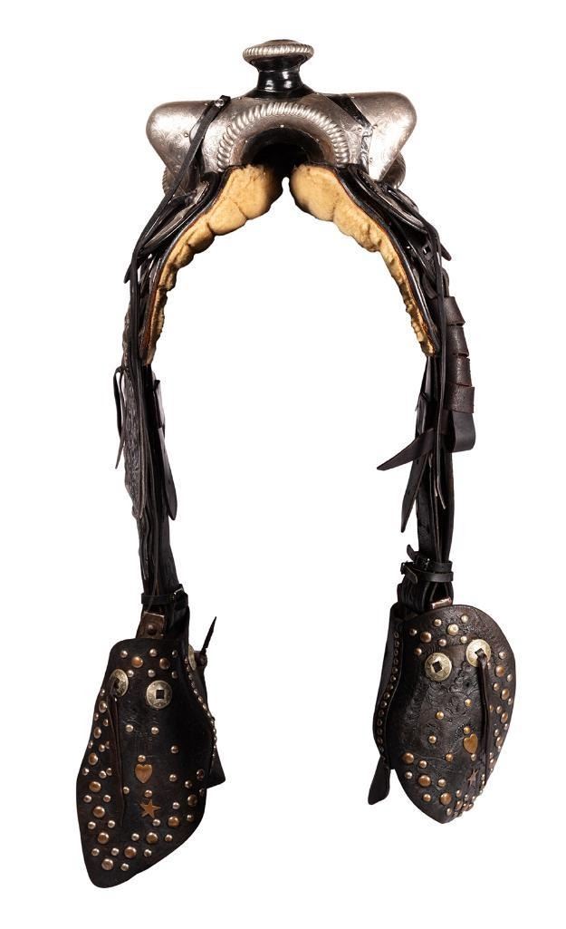 15” seat, floral tooled silver mounted with diamond designs. Tapaderos have different designs - stars, hearts and silver rosettes with silver tacks. A saddle stand will accompany the lot.