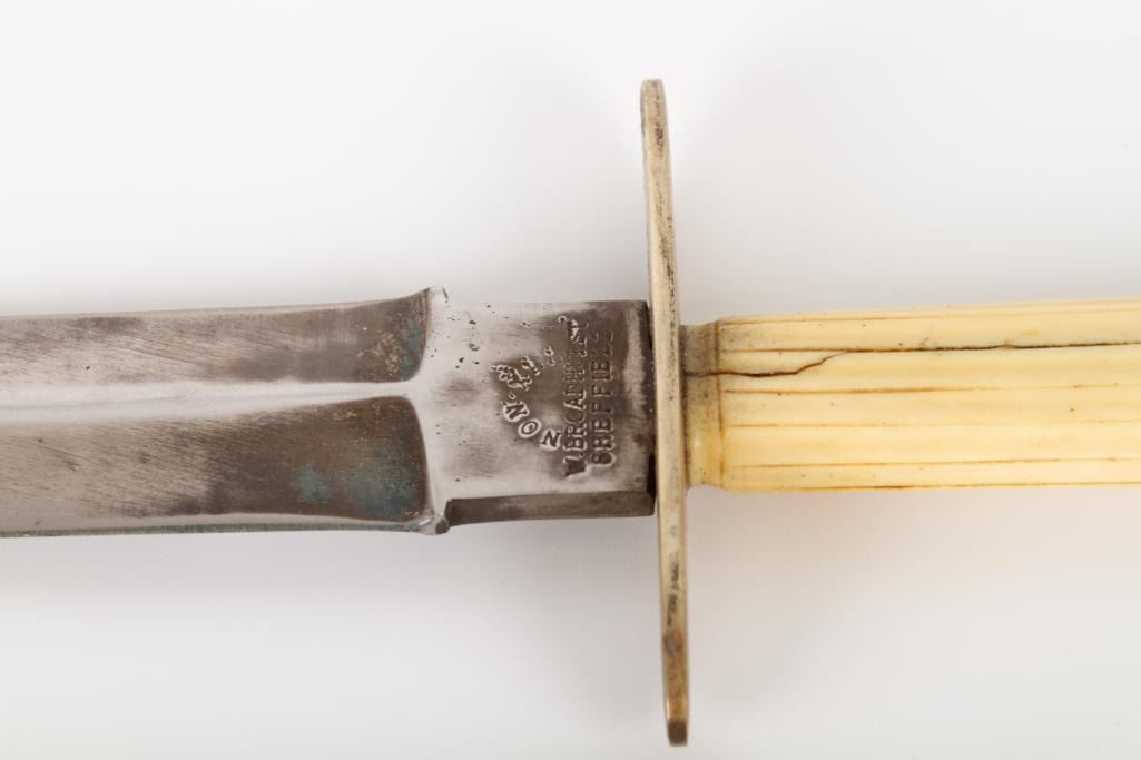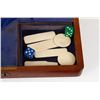 Cased set including knife with ivory handle, 12" long with 7" blade, Remington Smoot Revolver, nickel plated, 30 caliber. Includes gambling dice and chips.