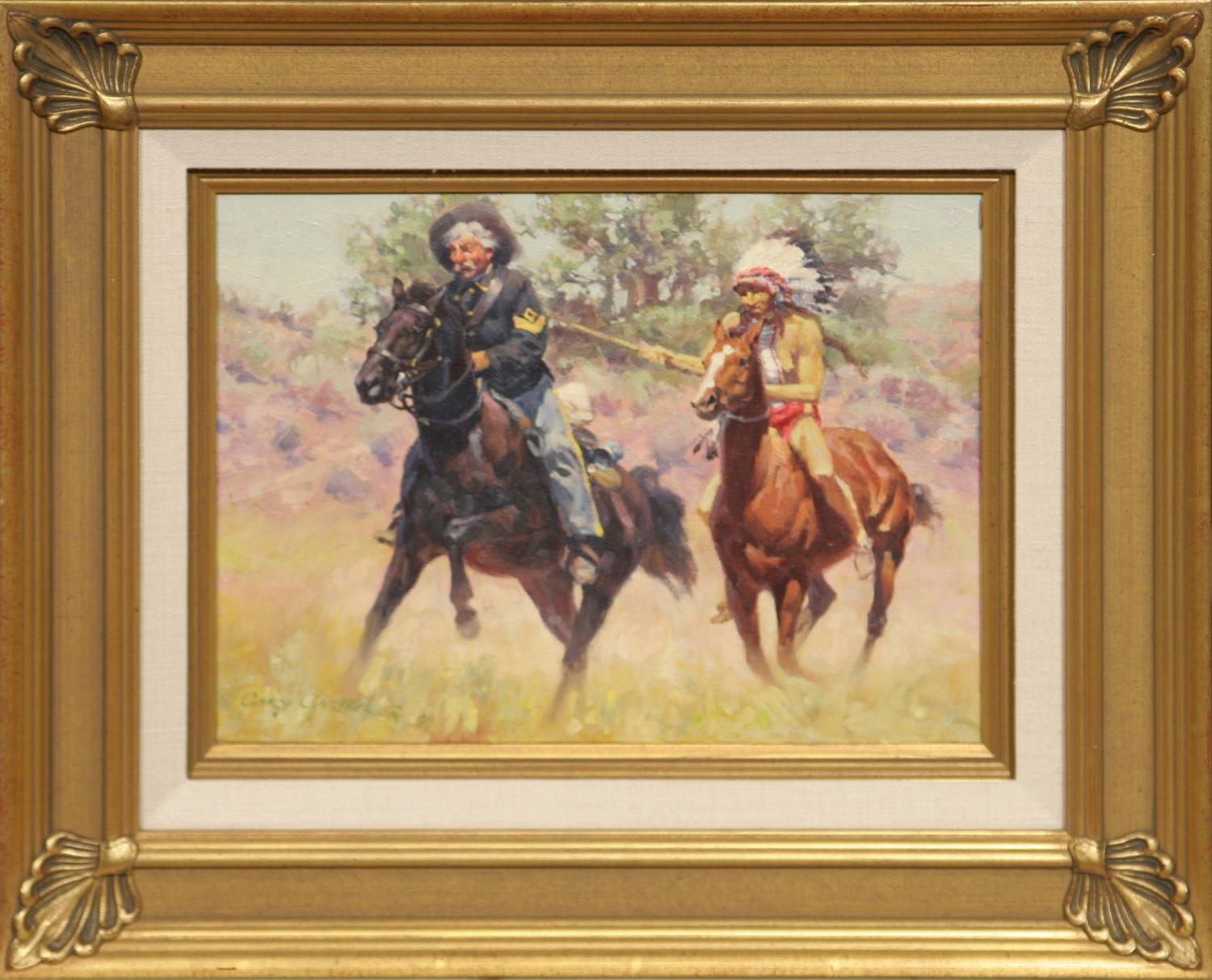 Gary Carter (b. 1939) CAA. Counting Coup. 9" x 12" oil on canvas. signed & dated 1994 lower left. (est $1,000-1,500) Condition Report: Black lights clean. In fine gold frame
