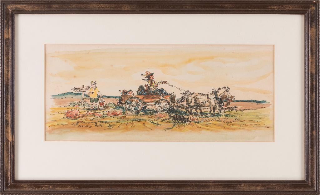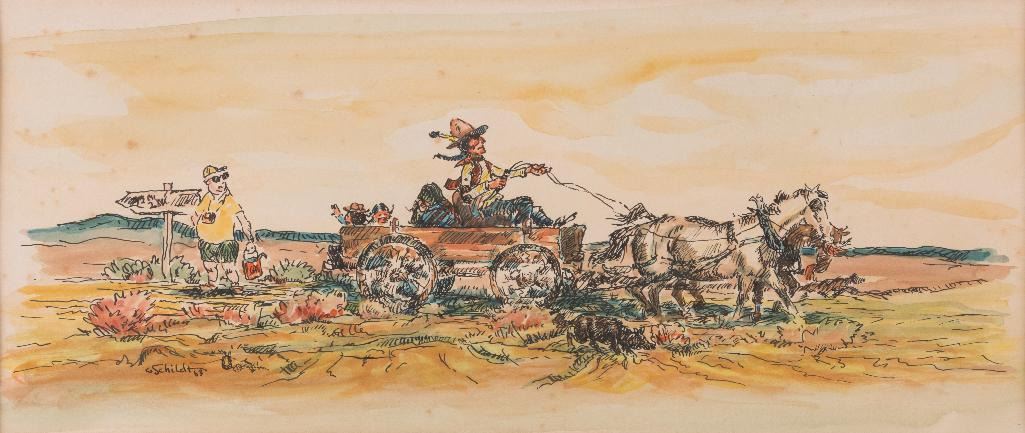 Gary Schildt (1938 - ) Two works: 1) No Hitchhikers Allowed 7 .75" x 18" mixed media Signed and dated '63 lower left 2) Portrait 8" x 8" watercolor Signed lower right $500-700