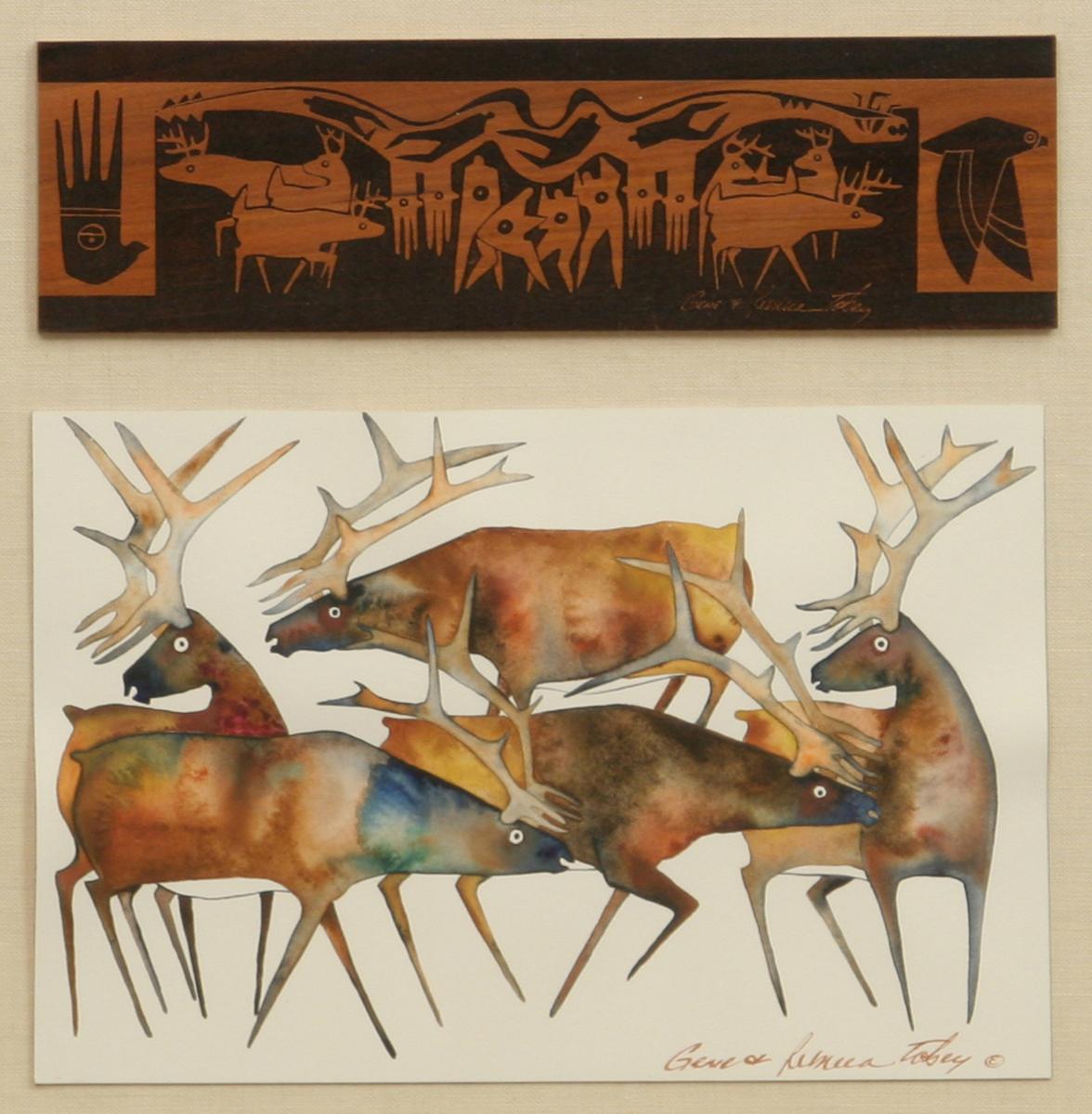 Gene Tobey (1945-2006) and Rebecca Tobey (b. 1948). The Gathering at Lookout. 8" x 12" watercolor. 3 ½" x 12" inlay wood. both signed lower right. (est $2,500-3,500) Condition Report: Fine condition