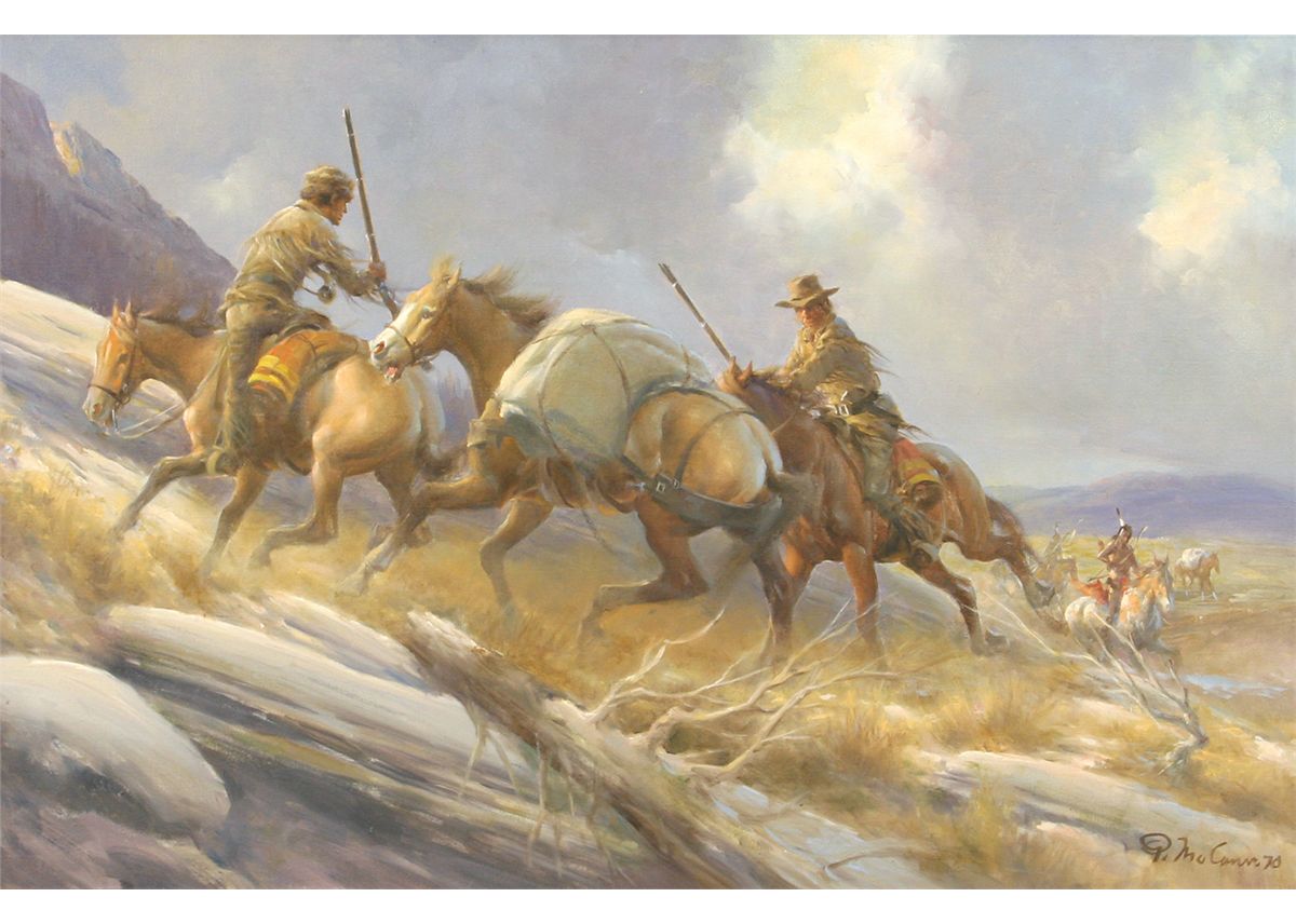 Gerald McCann (1916 - ). Headin' For Timber. 24" x 36" oil on board. Signed lower right: G. McCann '70. Condition reports can be viewed at www.marchinmontana.com/docs/2013CR.pdf