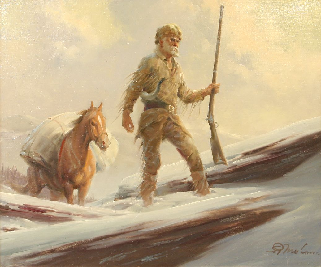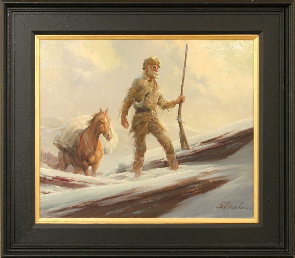 Gerald McCann (1916 - ). Mountain Man In Snow. 20" x 24" oil on canvas. Signed lower right: G. McCann. Condition reports can be viewed at www.marchinmontana.com/docs/2013CR.pdf