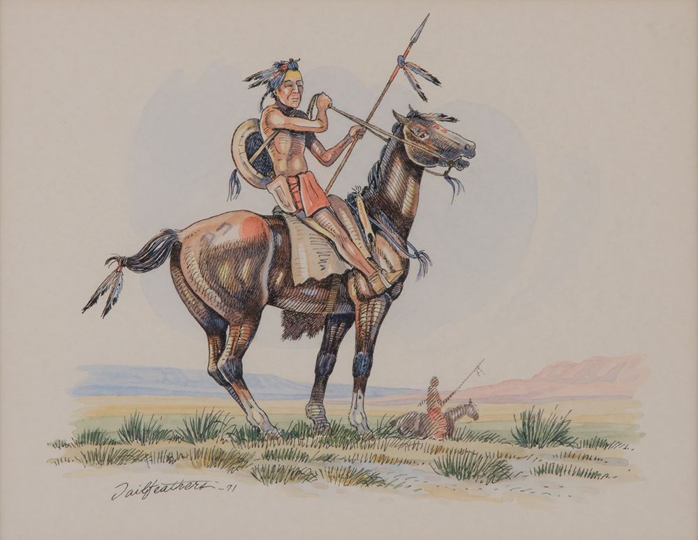 Gerald Tailfeathers (1925-1975). Both 7" x 9" mixed media. 1) Warrior with Lance and Shield. Signed and dated 71 lower left. 2) Indians with Travois and Colt. Signed and dated 70 lower right.