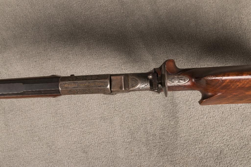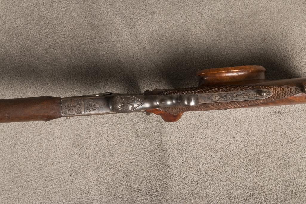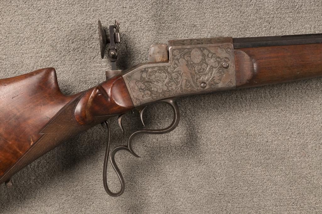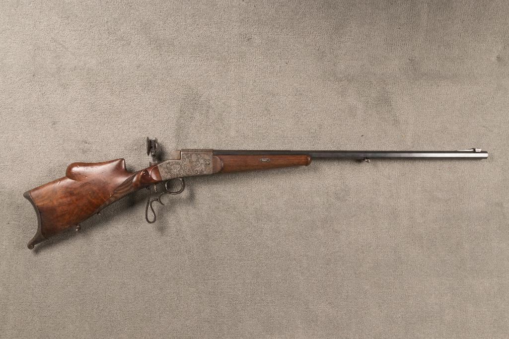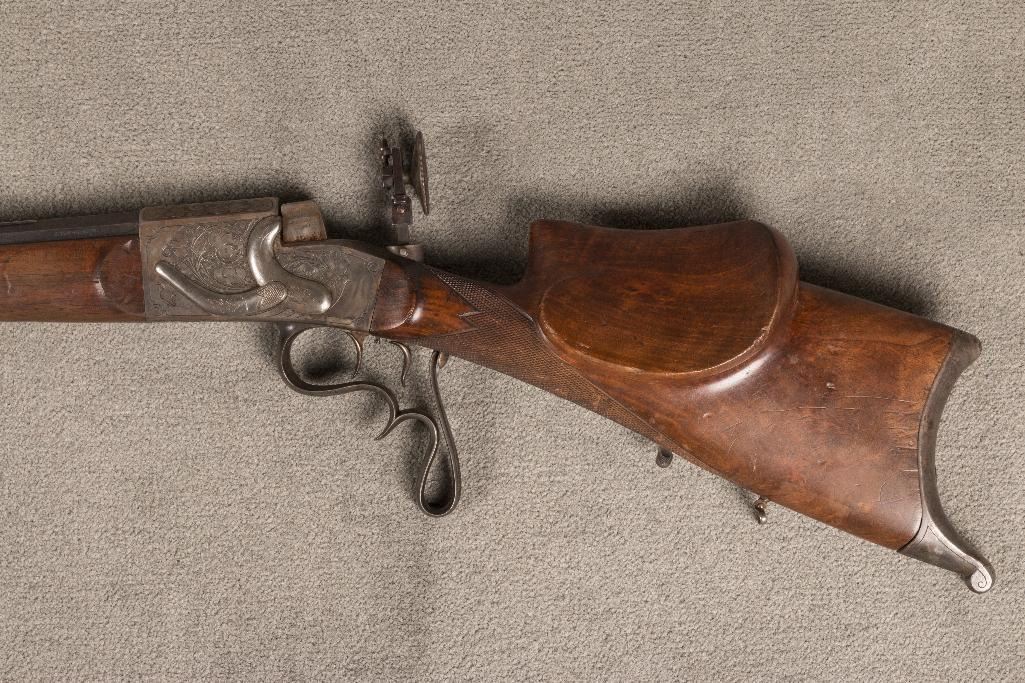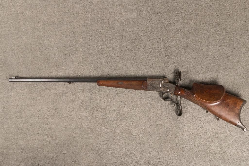 German Schuetzen Rifle Hamel AYDT maker. Carved walnut stock, engraved action. Original sites. Falling Block action. Carved walnut stock. 8.15 x 46 caliber. Double set triggers. $2,500-3,500