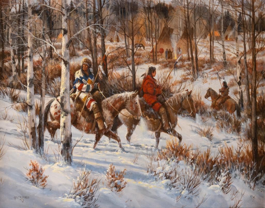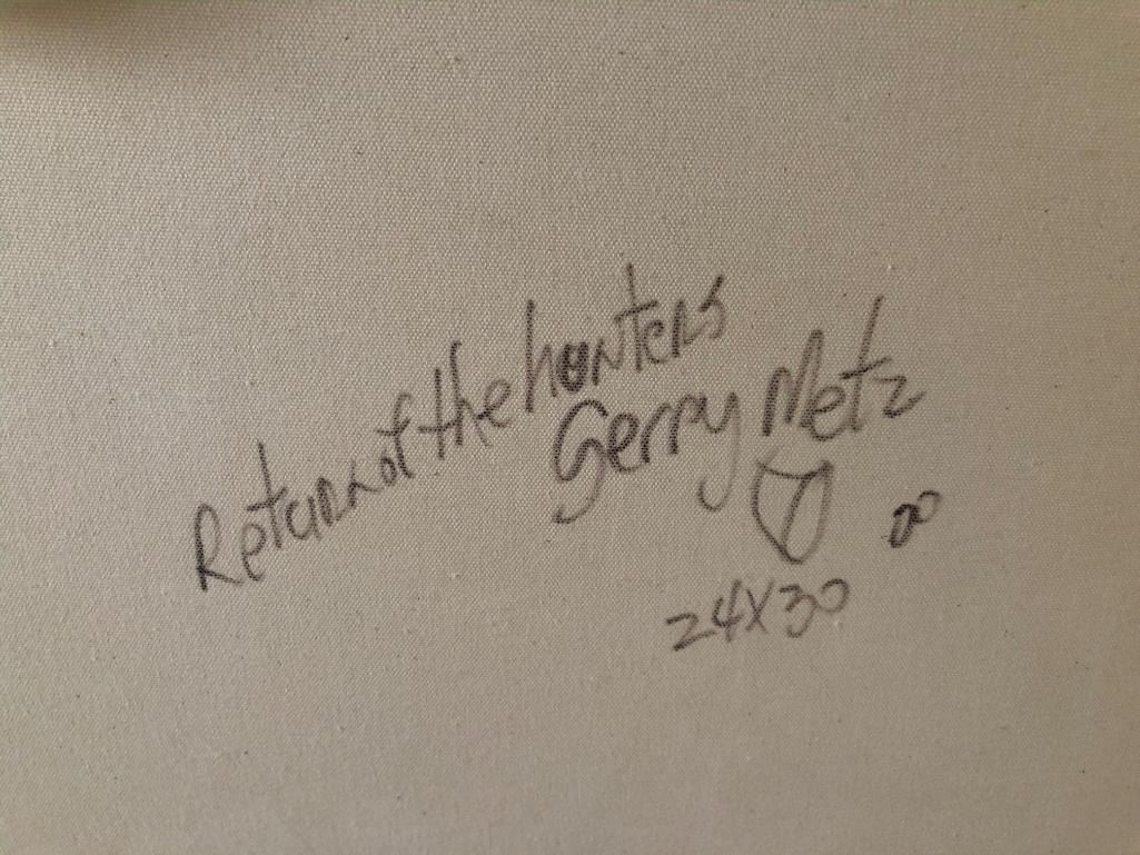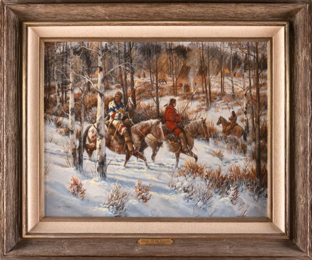 Gerry Metz (1943-2018) Return of the Hunters 24" x 30" oil on canvas Signed lower left Verso: Titled and signed. $3,000-5,000 Provenance: The Salah M. Hassanein Collection. Present owners, by descent 2019.