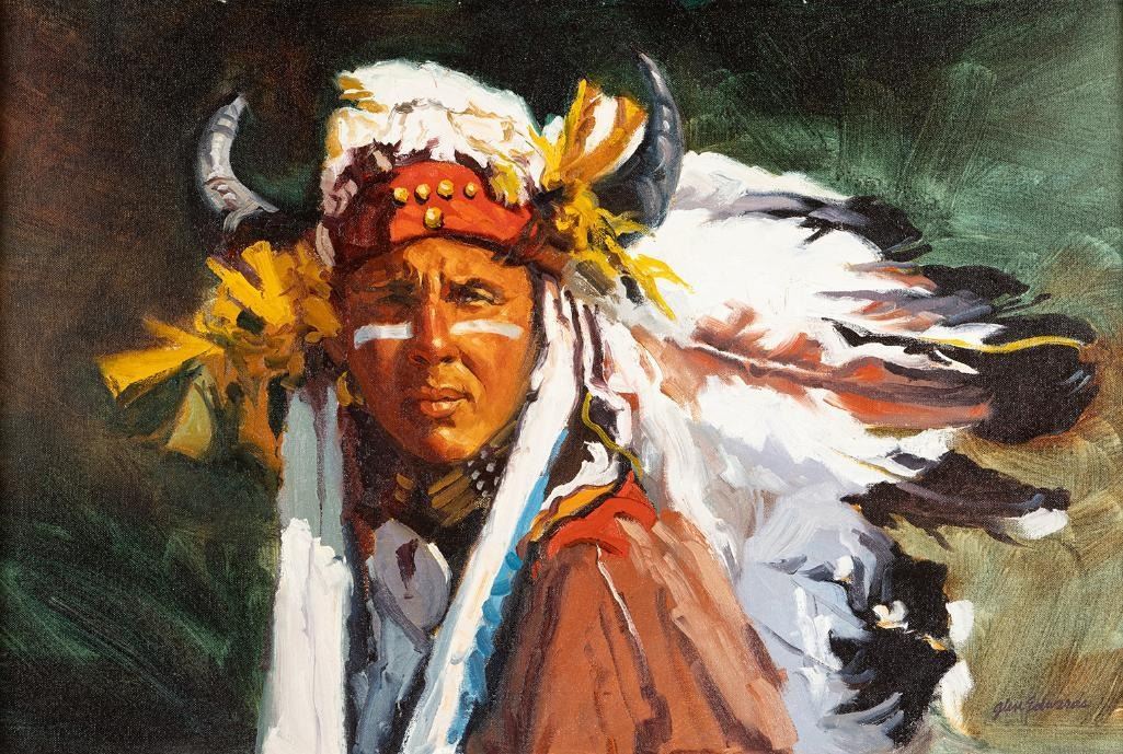Glen Edwards (b. 1942) Chief Yellow Hand 20" x 30" oil on canvasboard Signed lower right Verso: Titled and signed. $1,500-2,500 Provenance: Private Collection, Mountain Center, CA.
