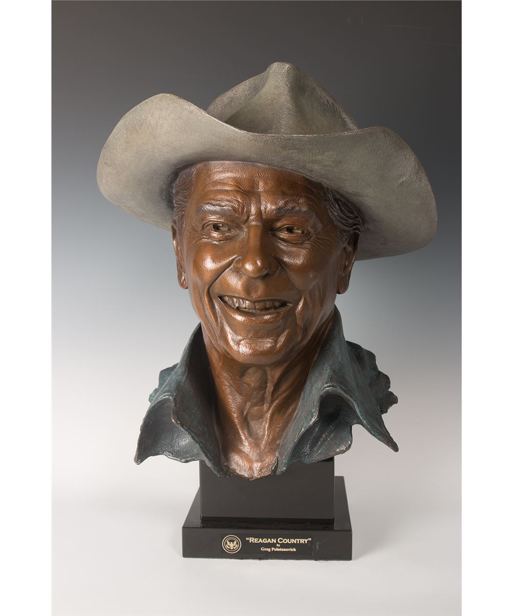 16" x 13" x 15" bronze. Stamped: "Reagan Country". Commissioned by The Ronald Reagan Presidential Foundation. Artist Greg Polutanovich. Edition 2/40. Provenance: Estate of Ken Holm, Denver, CO.