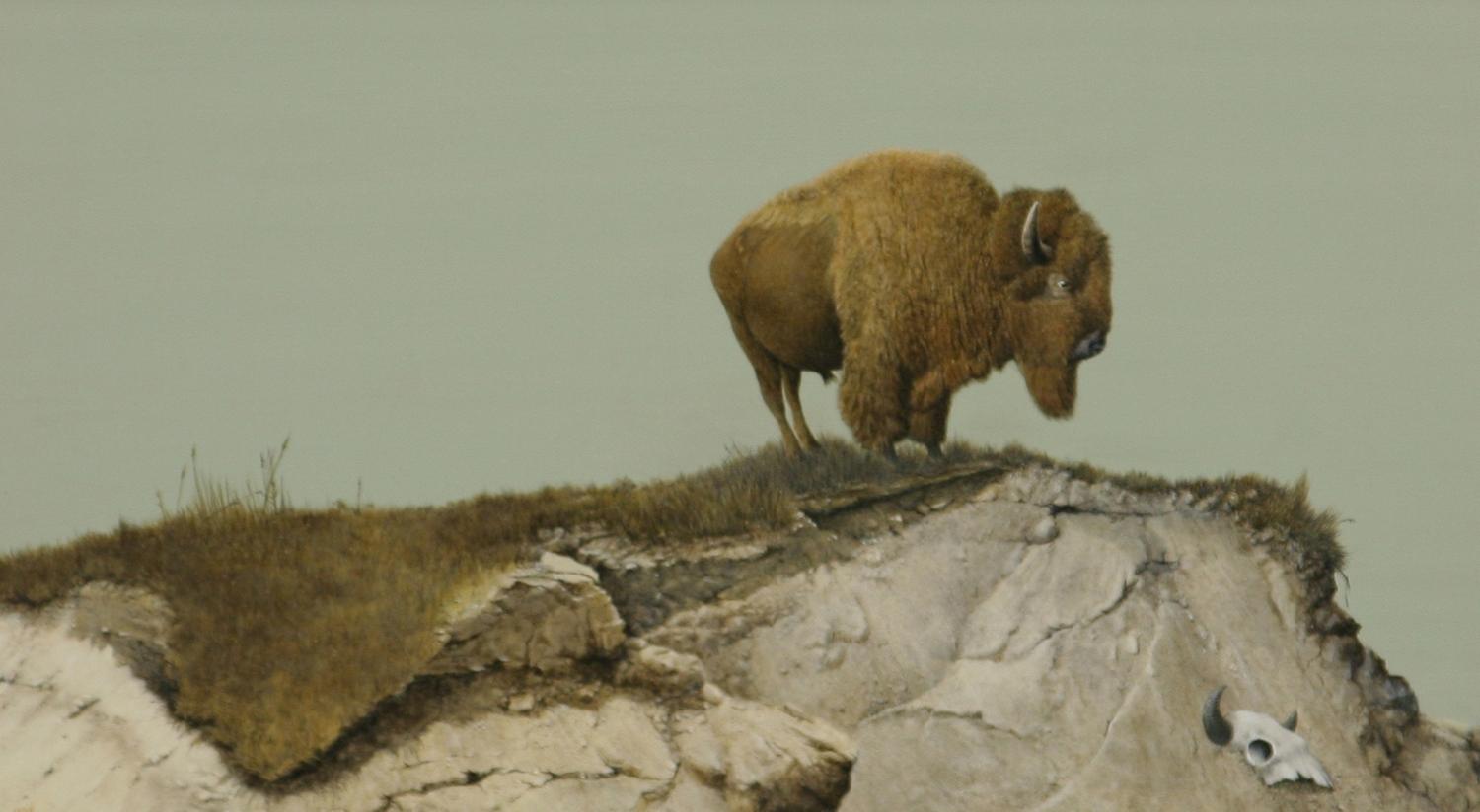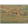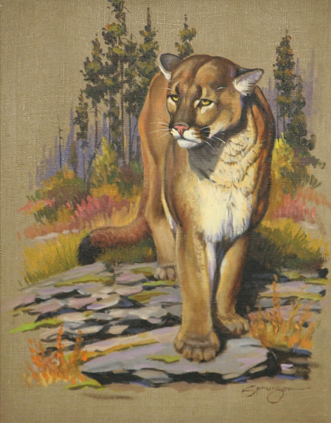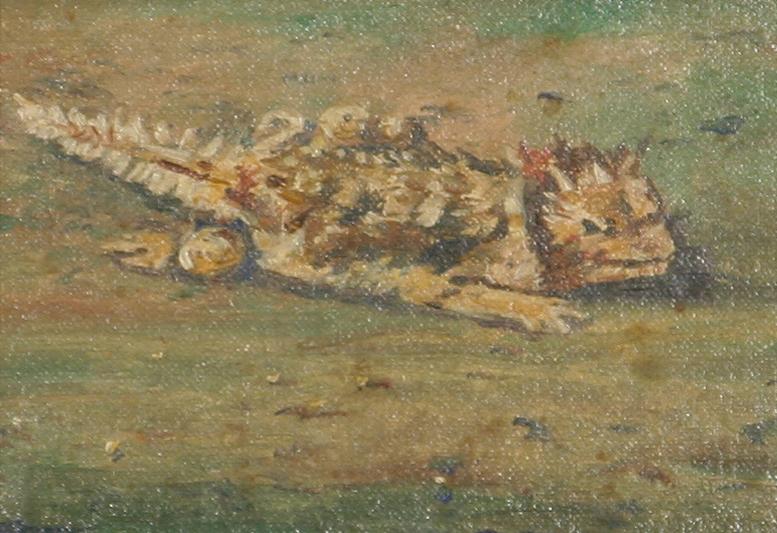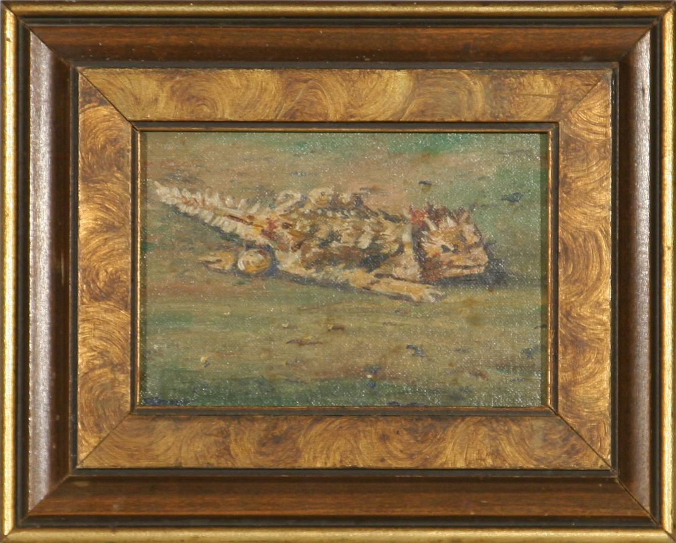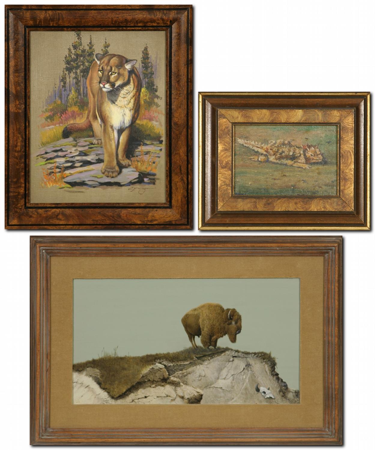 Three Paintings. (1) Elmer Sprunger (1919-2007). Cougar. 10" x 8" oil on canvas. signed lower right. (2) E. A. Burbank (1858-1949). Horned Toad. 4" x 6" oil on canvas/board. signed lower right & verso. (3) James Lund. Buffalo. 7 ¼" x 12" oil on board. signed lower left. (est $1,000-$1,500) Condition Report: All black light clean