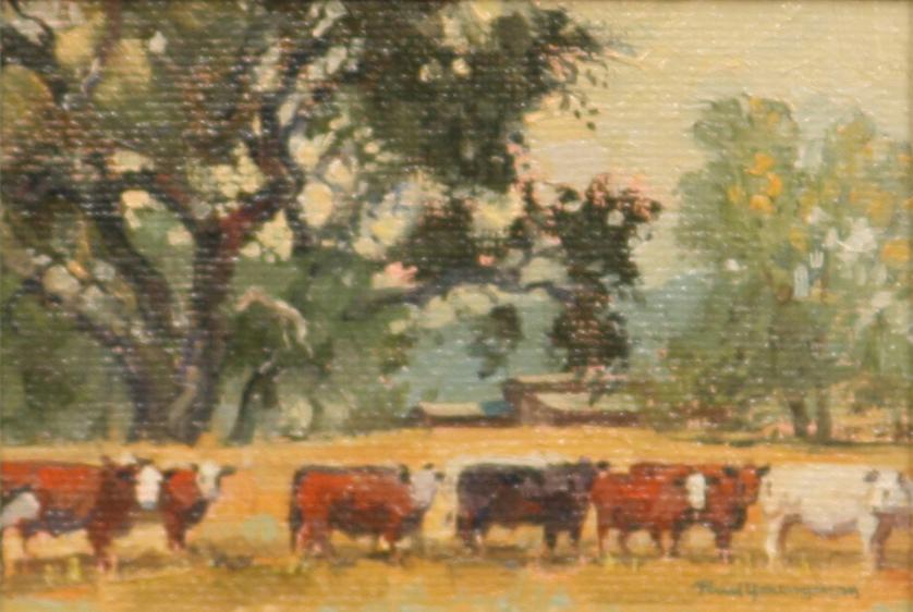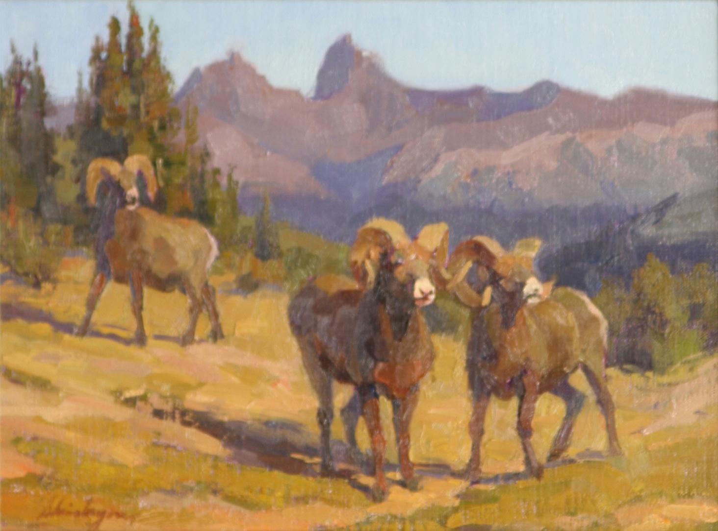 Three Paintings. (1) Kay M. Hendricks (1923-2005). Homestead. 9" x 12" oil on board. signed lower left. (2) Tim Shinabarger (b. 1966). Rams Near Pilot and Index Peak. 9" x 12" oil on board. signed lower left, dated 1995 on back. (3) Paul Youngman (b. 1941). Here's Looking At You!. 5" x 7" oil on board. signed lower right. (est $2,000-3,000) Condition Report: All black light clean