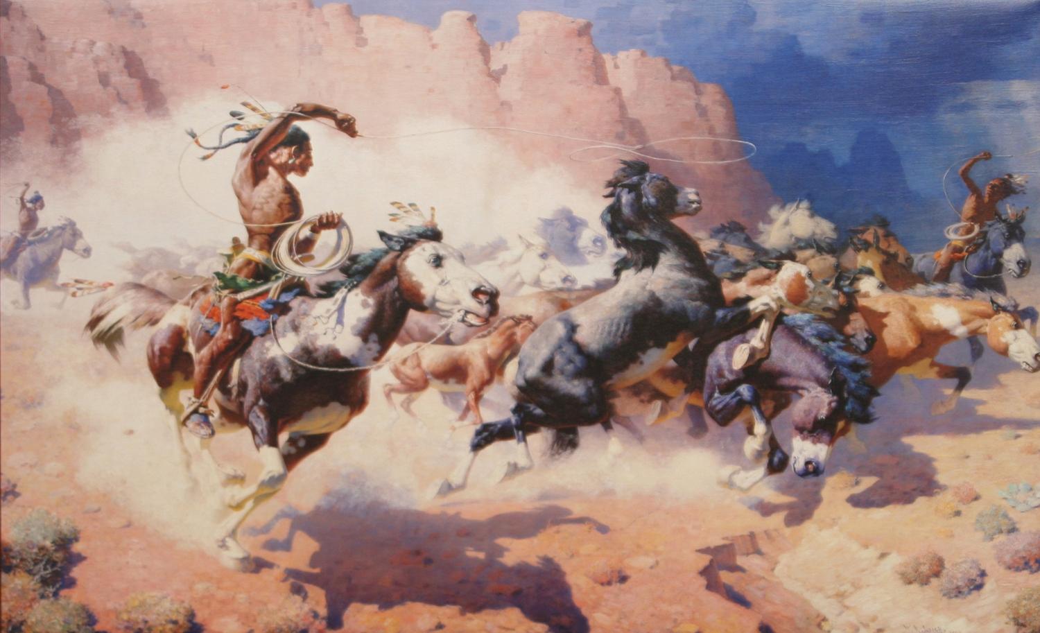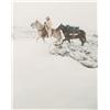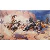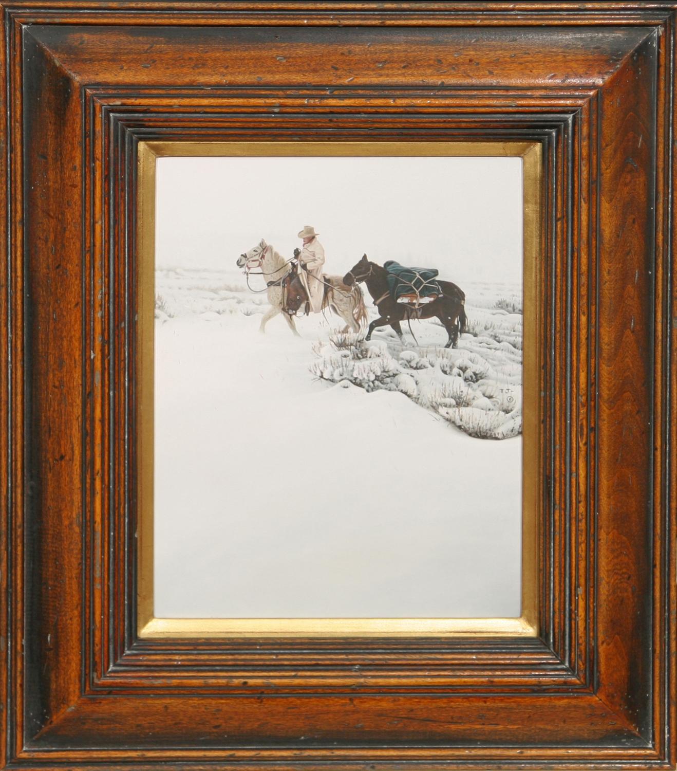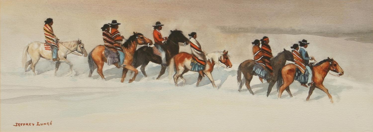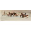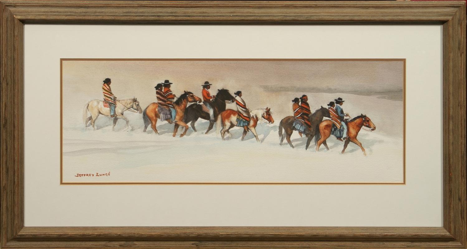 Three Art Pieces. (1) William R. Leigh (1866-1955). The Leader's Downfall. 23" x 36" print, #129/980. (2) T. J. Feeley (20th century). Huntin' Bulls. 14" x 11" oil on board. signed center left & verso. (3) Jeffrey Lunge (b. 1905). Riding Party In The Snow. 11" x 29" watercolor. signed lower left. (est $600-900) Condition Report: All in fine condition and 2) black lights clean
