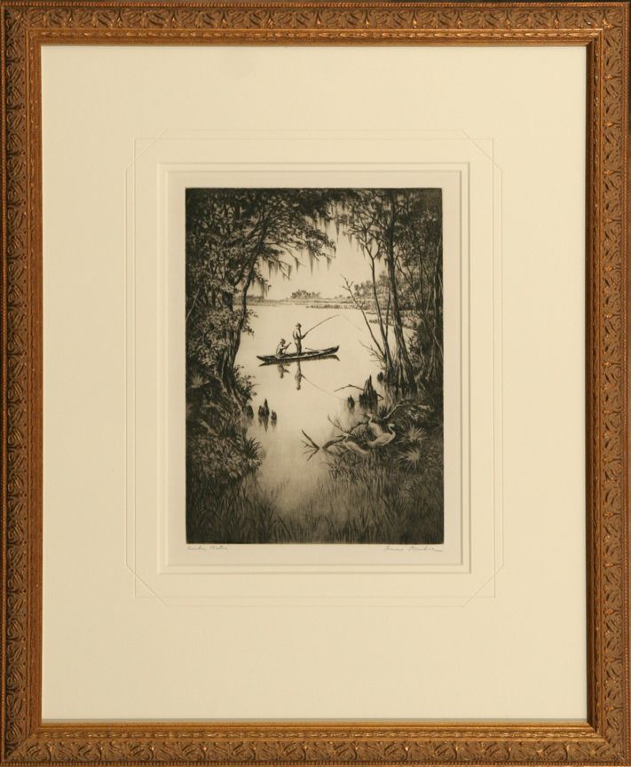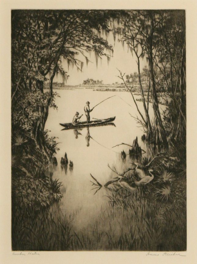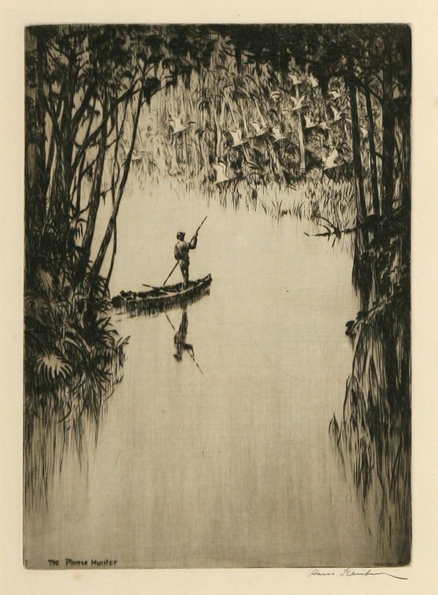 Hans Kleiber (1887 - 1967). Two etchings: Amber Water. 10.75" x 7.75" etching. Pencil signed lower right: Hans Kleiber. Titled in pencil lower left. The Plume Hunter. 11.75" x 8.25" etching. Pencil signed lower right: Hans Kleiber. Includes copy of Hans Kleiber, Wyoming Printmaker & Artist by Marylee M. Moreland & Gary Temple. Condition reports can be viewed at www.marchinmontana.com/docs/2013CR.pdf