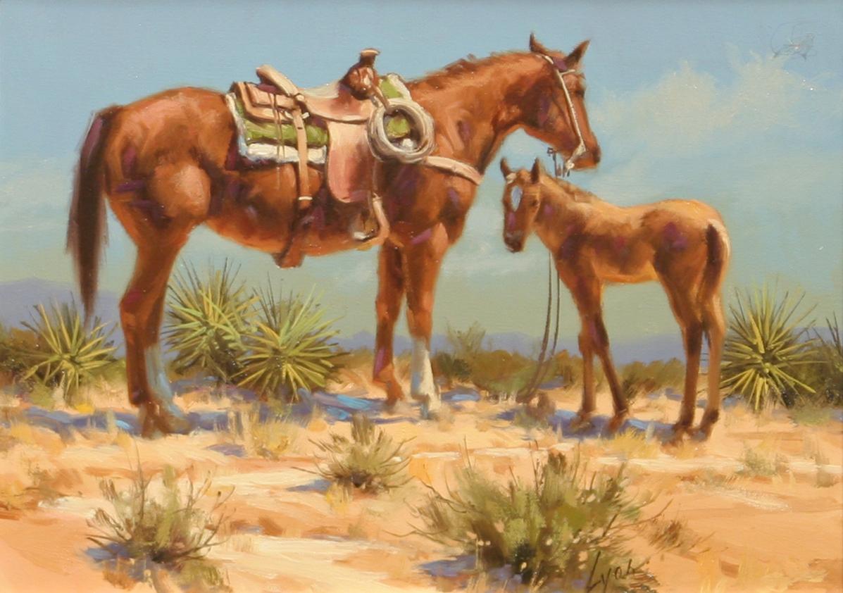 Harold Lyon (b. 1930). Staying Close. 18" x 24" oil on canvas. signed lower right. (est $1,000-2,000) Condition Report: Black lights clean