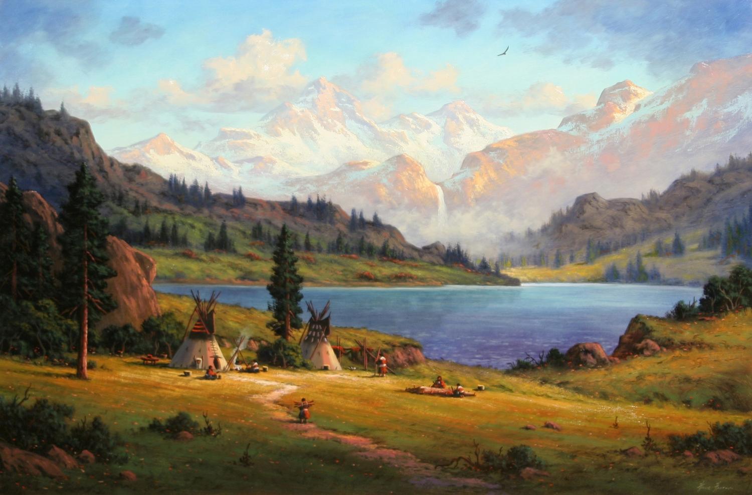Heinie Hartwig (b. 1939). Rocky Mountain Cheyenne Camp. 30" x 44" oil on board. signed lower right. (est $3,500-4,500) Condition Report: Black lights clean