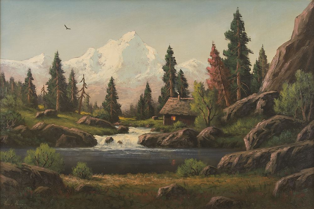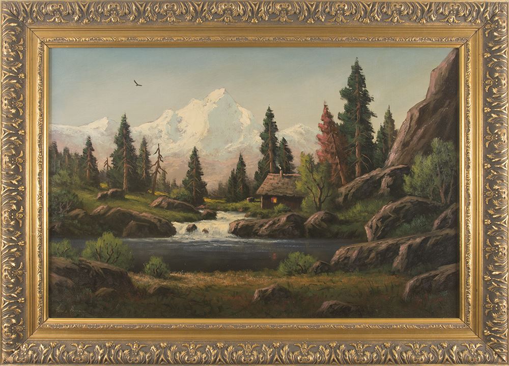Heinie Hartwig (1937- ). Mount Shasta, CA. 20" x 30" oil on board. Signed lower left: HEINE HARTWIG. Verso: Titled.
