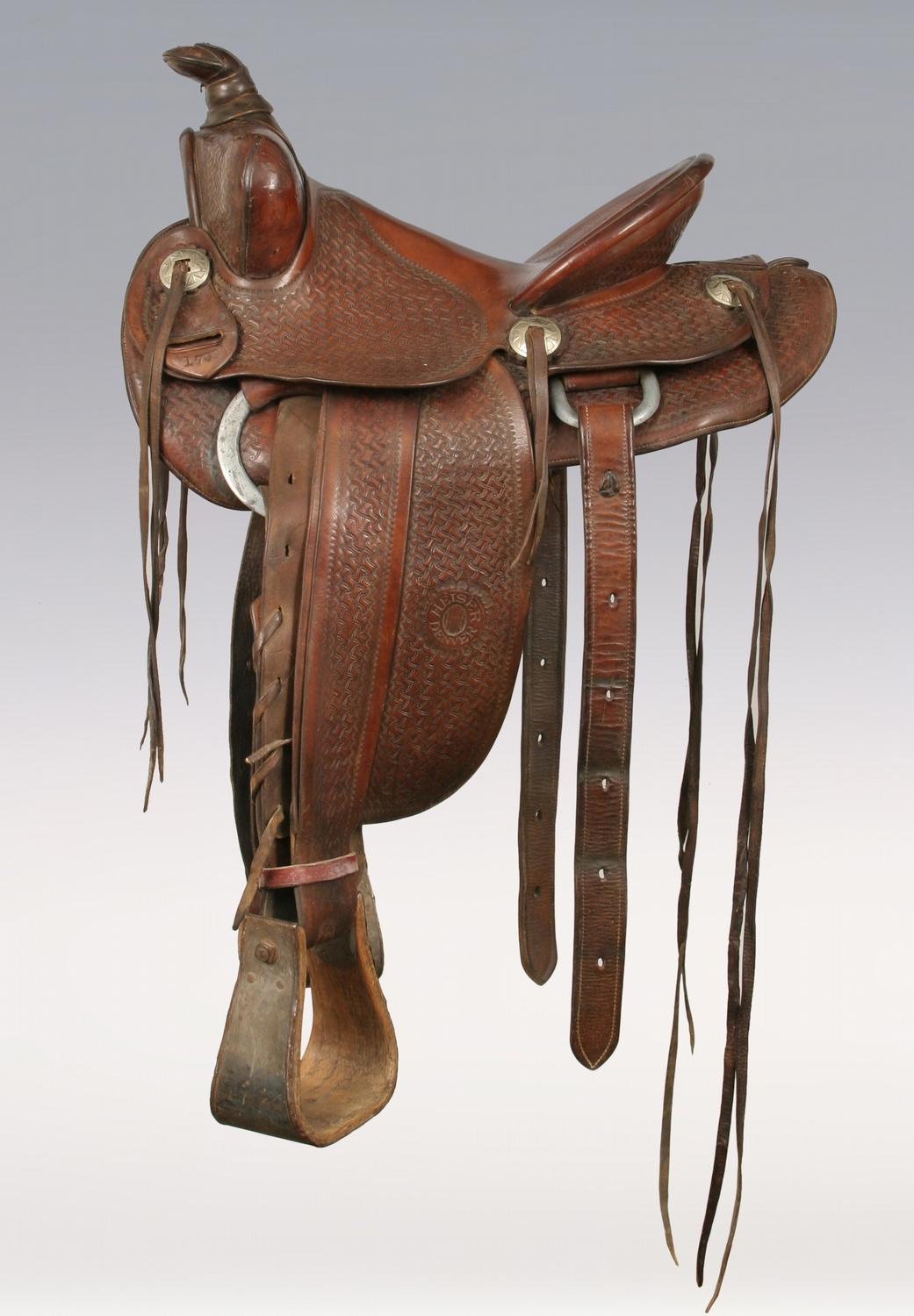 Heiser Woman's Embossed Saddle. 14", Rideable. C. 1940s, fine condition. (est $800-1,200) Condition Report: Fine condition and ready to ride