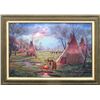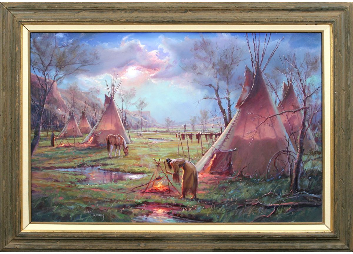 Hulan Fleming (1933 - ). Crow Camp. 24" x 36" oil on board. Signed lower left: Hulan Fleming. Condition reports can be viewed at www.marchinmontana.com/docs/2013CR.pdf