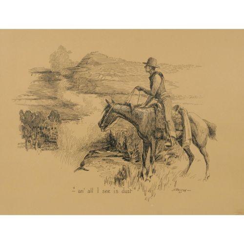 J.K. Ralston (1896-1987) an' all I see is dust, 12 ½” x 16 ¾” pen and ink drawing, signed LR, dated '37