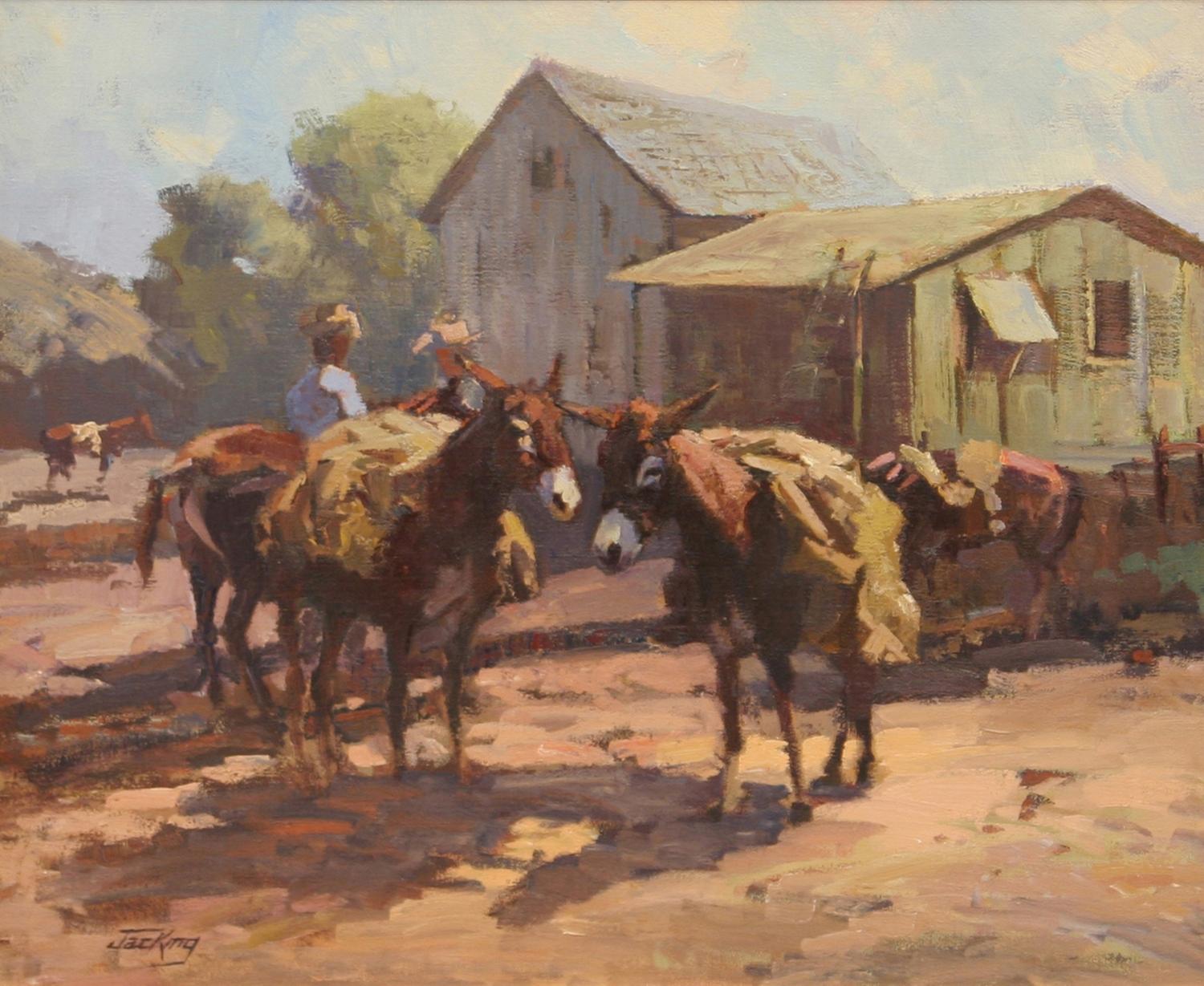 Jack King (20th century). Pack Mules. 20" x 24" oil on canvas. signed lower left. (est $800-1,200) Condition Report: Black lights clean
