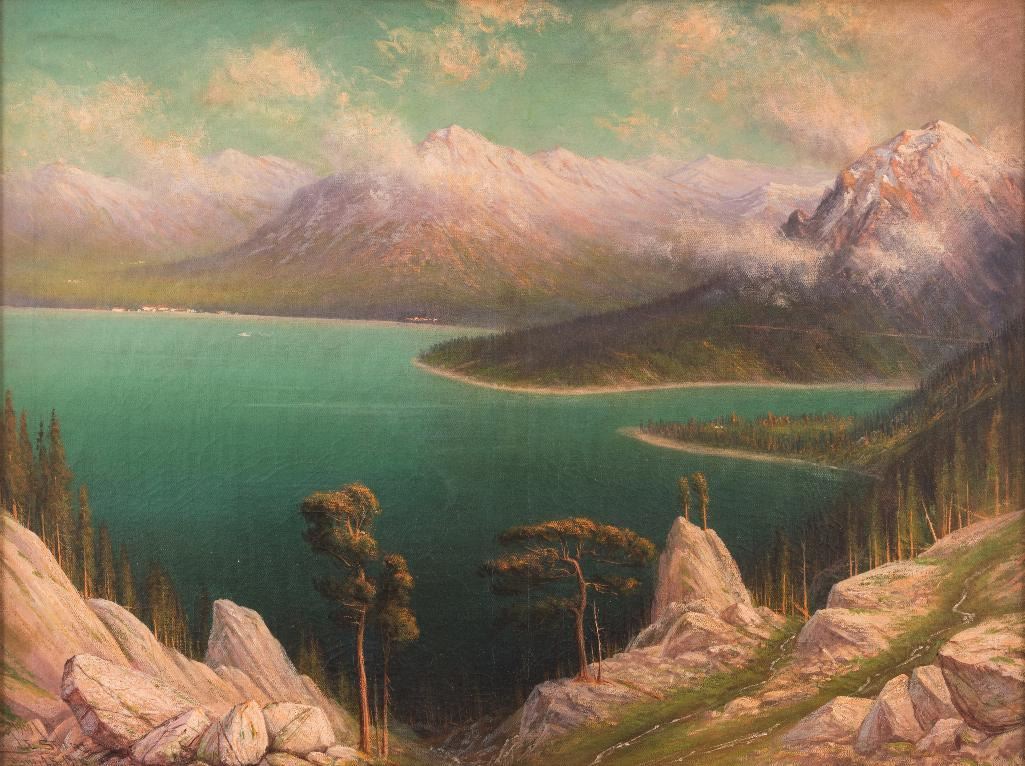 James Everett Stuart (1852-1941) Emerald Bay, Lake Tahoe 30" x 40" oil on canvas Signed and dated 1914 lower left Verso: "Mt. Tallac in distance. Emerald Bay to right in middle distance, from near top of Rubicon Point, Lake Tahoe, Calif. June 25, 1914. J.E. Stuart" $3,000-5,000
